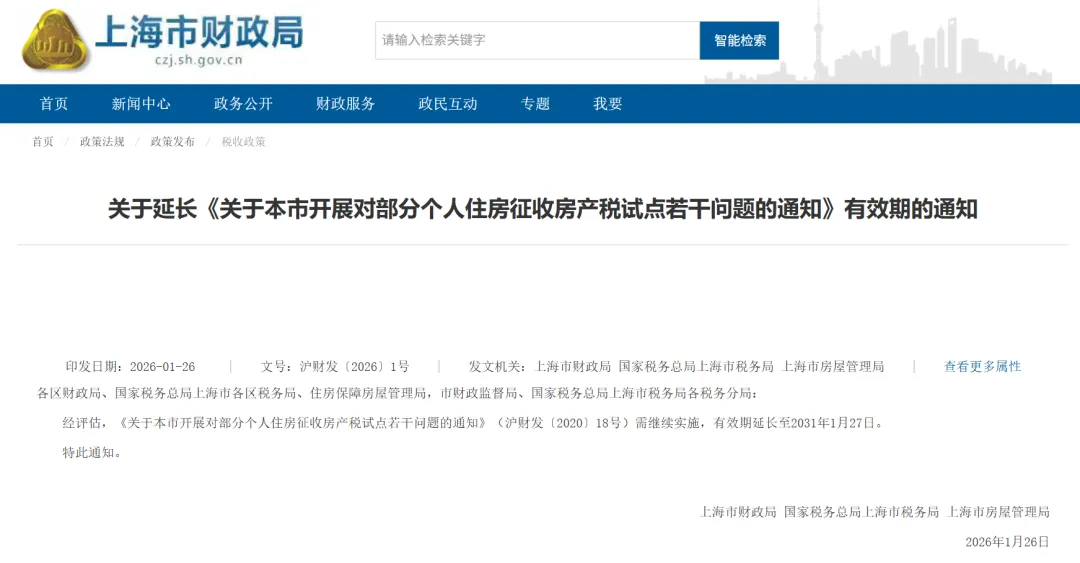 1 月 26 日,上海市财政局、国家税务总局上海市税务局、上海市房屋管理局联合发布通知,明确上海个人住房房产税试点政策将延续实施五年,有效期延长至 2031 年 1 月 27 日。