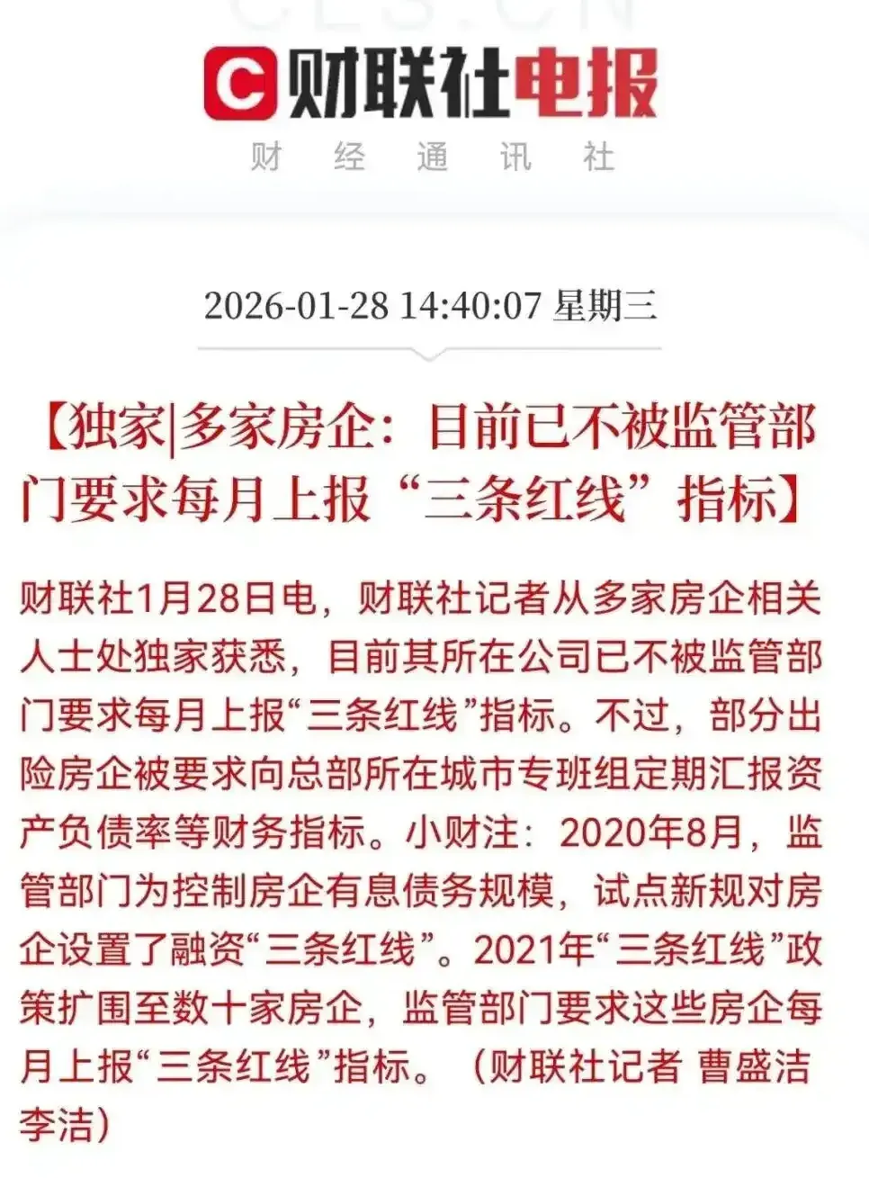 1 月 28 日,监管部门宣布不再要求多数房企每月上报 "三条红线" 指标,仅重点监控出险房企。