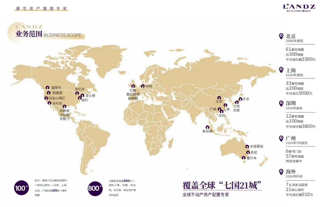 丽兹行豪宅成立20年整,专注3000万以上豪宅产品。全面覆盖北京上海深圳广州、及英美日澳德加新7个国家21个城市。立志成为城市领袖最信赖的豪宅资产管理专家。