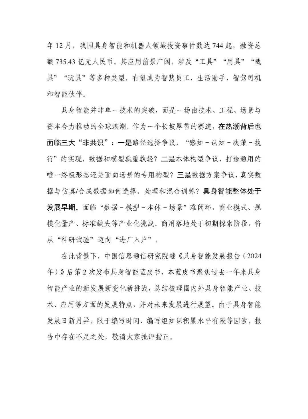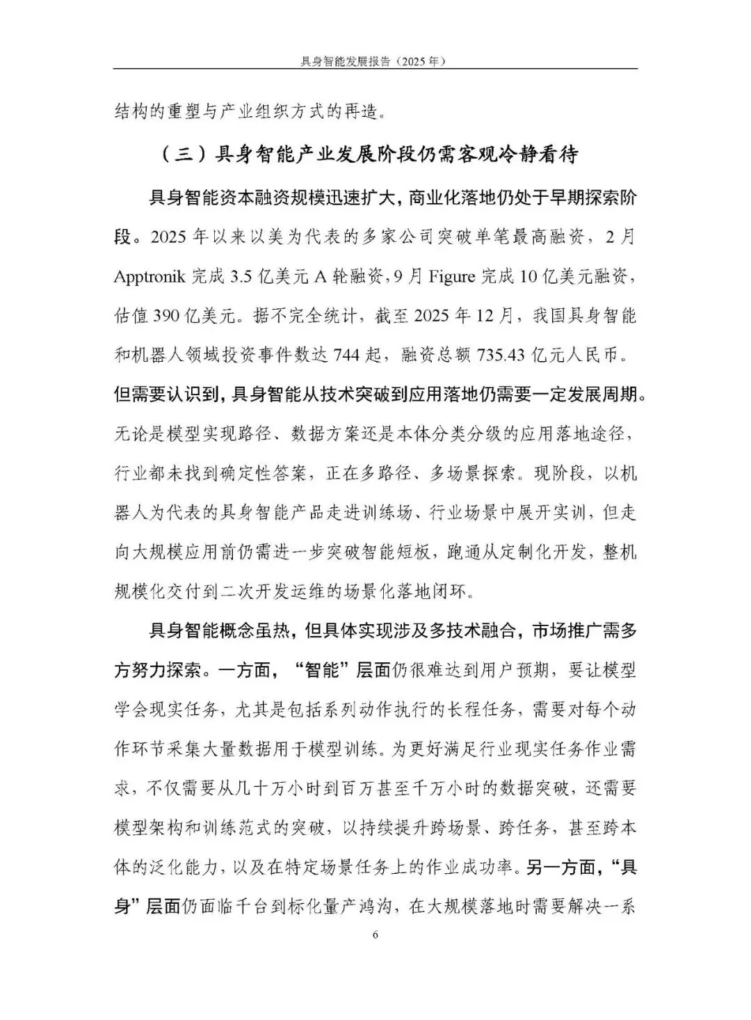 2025 年,具身智能被列入国家未来产业重点培育清单,成为全球科技前沿热点,其核心是通过物理本体与环境交互实现 “知行合一”,构建 “具身本体 - 智能内核 - 环境交互” 的智能闭环,以提升认知、协作、学习三大能力为目标。产业呈现 “融合”“多元”“繁荣” 特征,截至 2025 年 12 月,我国相关领域投资事件达 744 起,融资总额 735.43 亿元,但整体仍处于发展早期,面临路径选择、本体构型、数据方案三大 “非共识” 及产业化多重挑战。