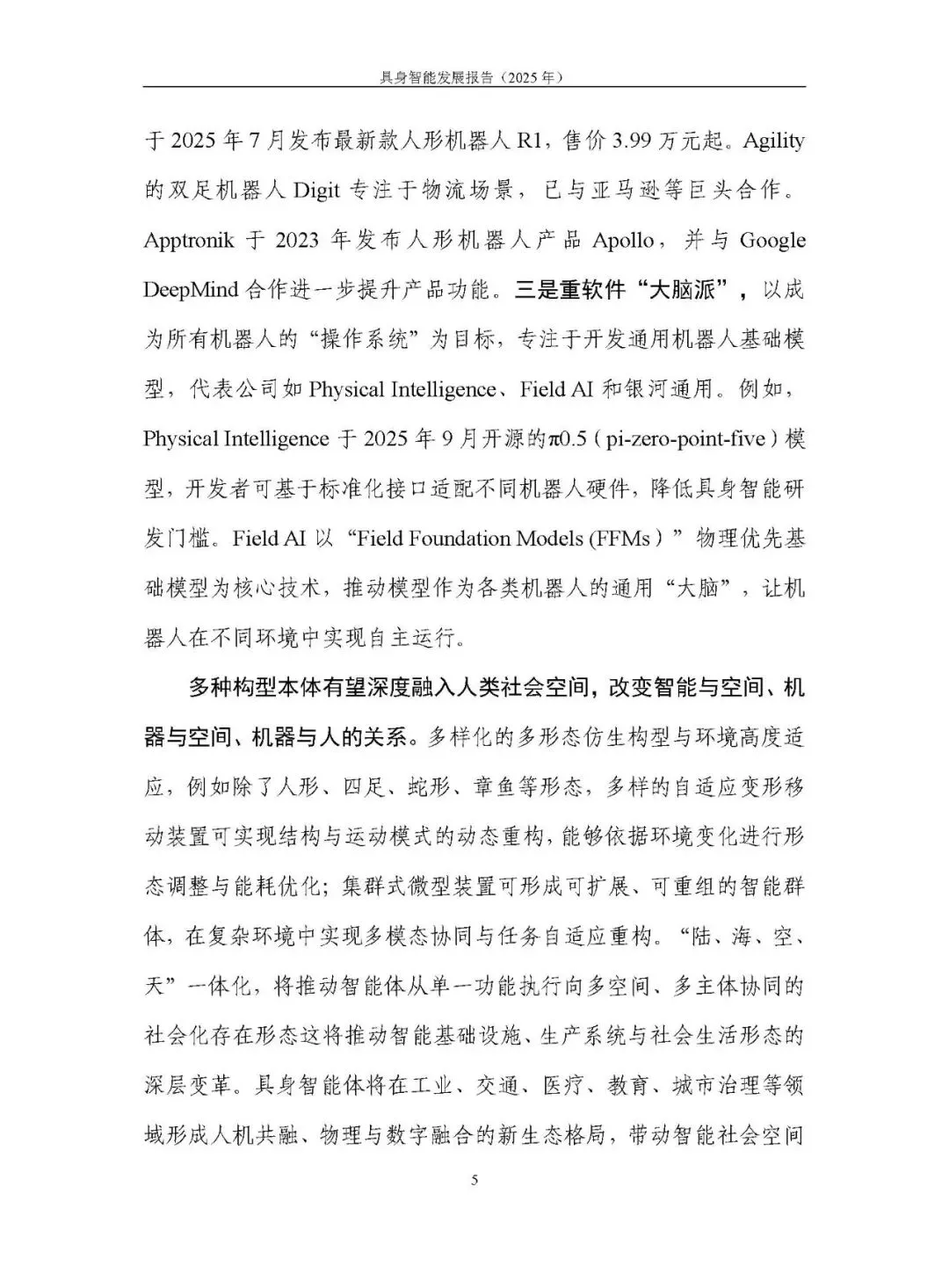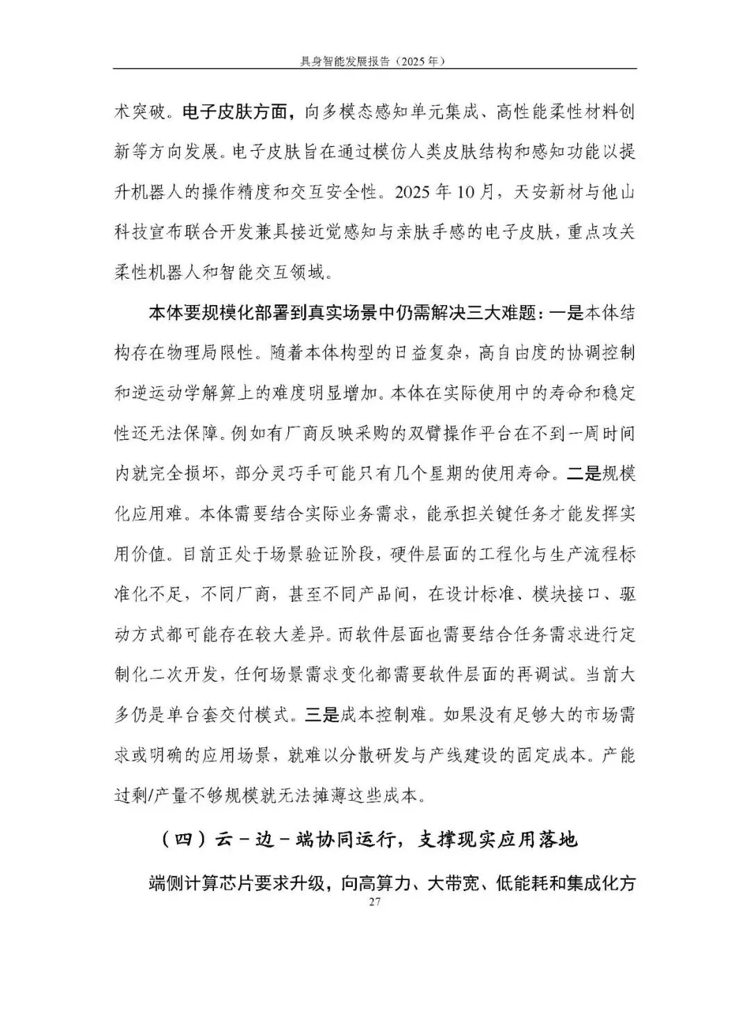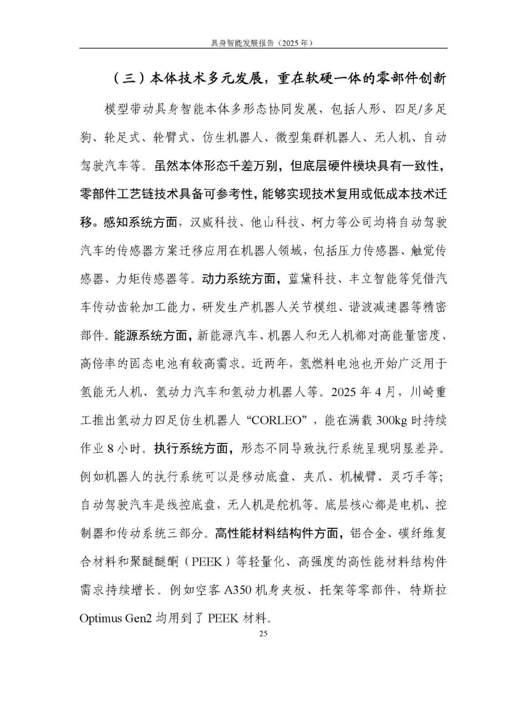 本体形态多元发展,涵盖人形、四足 / 多足、轮式等机器人及自动驾驶汽车等,底层硬件模块存在技术复用空间。机器人领域聚焦一体化关节、灵巧手、力触觉传感器等核心部件创新,但本体结构物理局限、规模化应用难、成本控制不易等问题亟待解决。