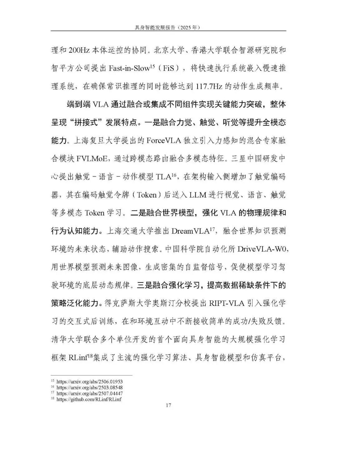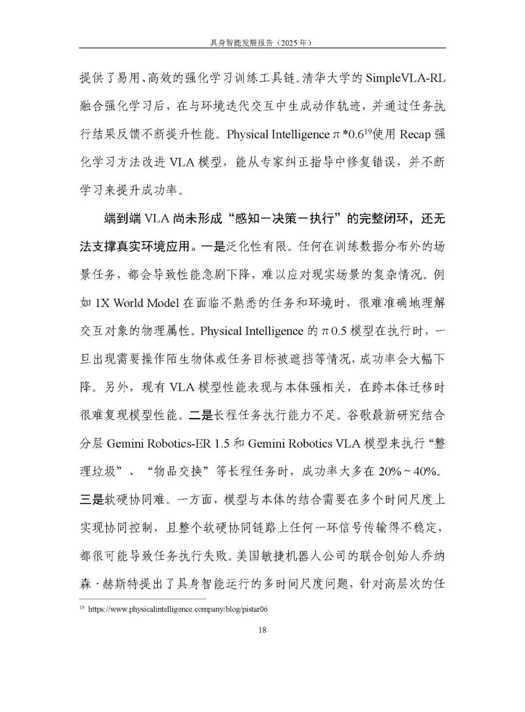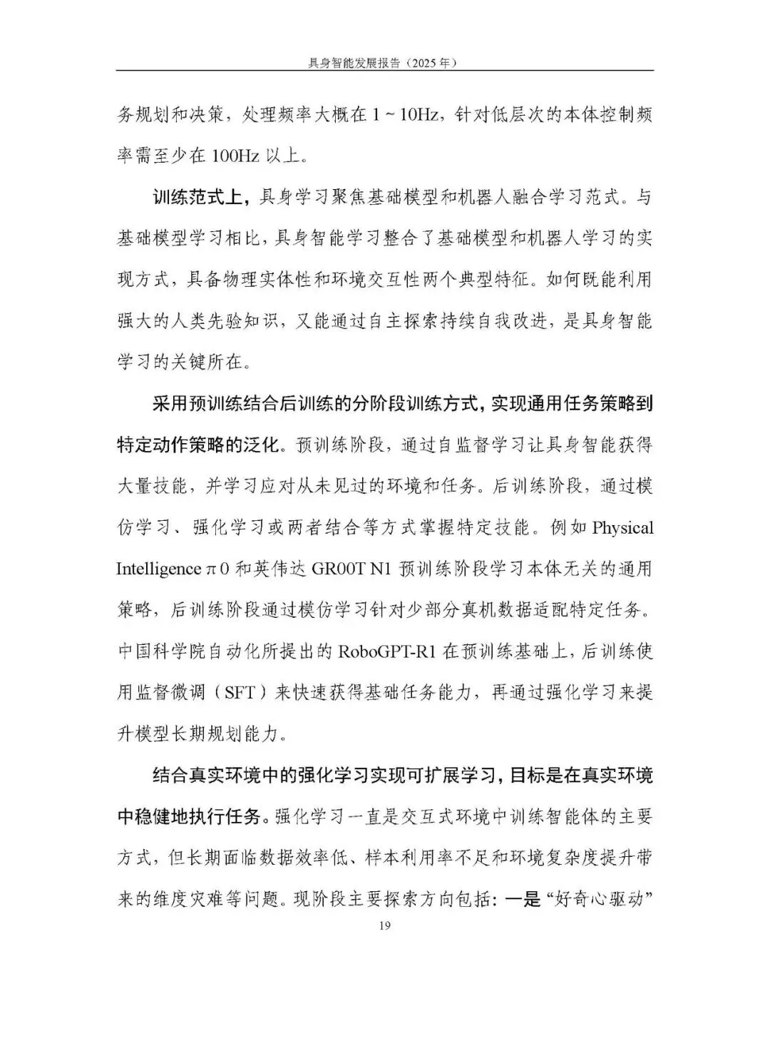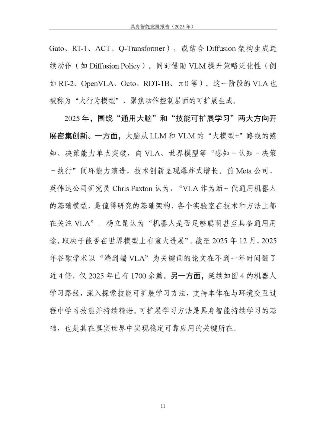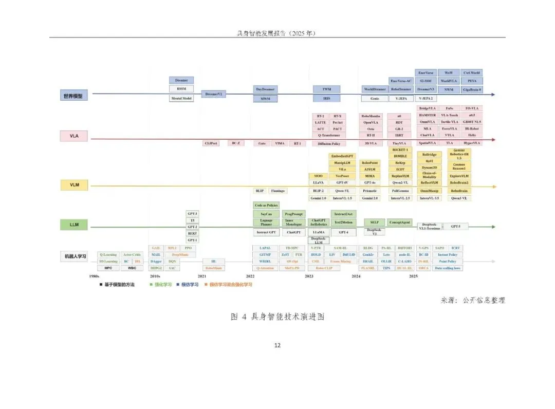 未形成统一路径,呈现模块化分层、分层大模型、端到端大模型、世界模型四条路线并行探索。2025 年聚焦 “通用大脑” 和 “技能可扩展学习”,端到端视觉语言动作模型(VLA)成为研究热点,论文数量大幅增长,但在泛化性、长程任务执行能力及软硬协同方面仍存不足。训练范式以预训练结合后训练为主,强化学习的自主探索、自我改进等方向持续突破。