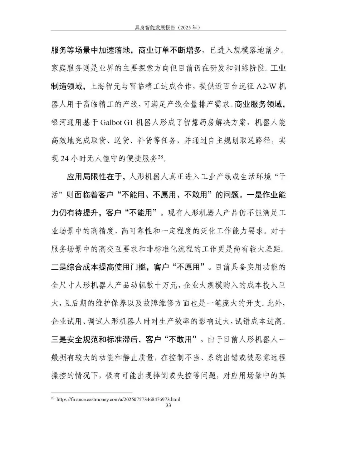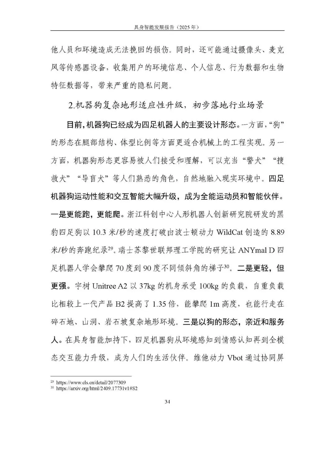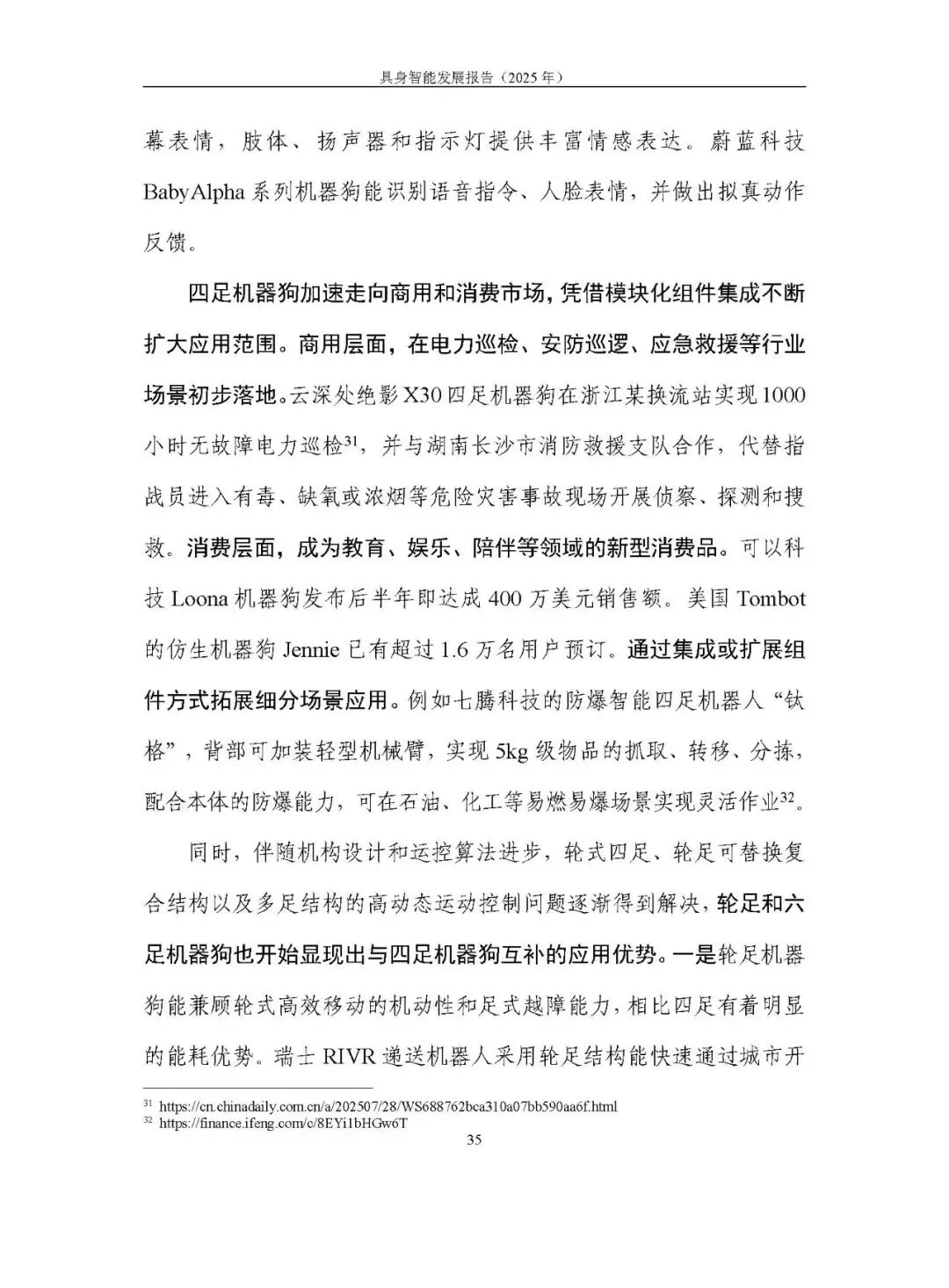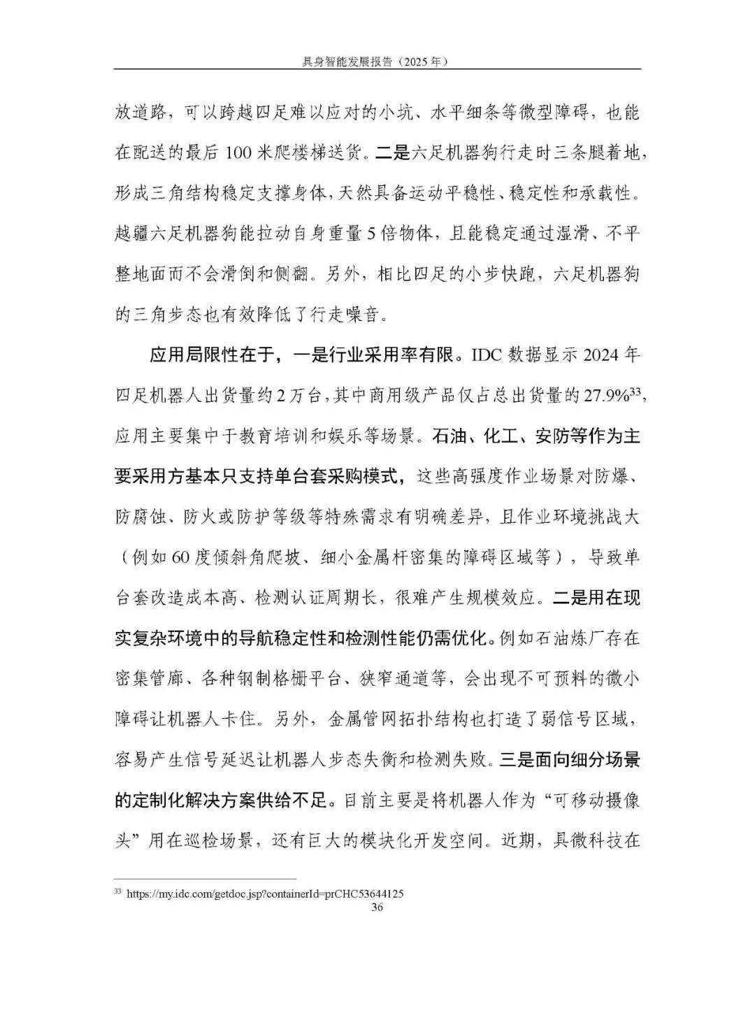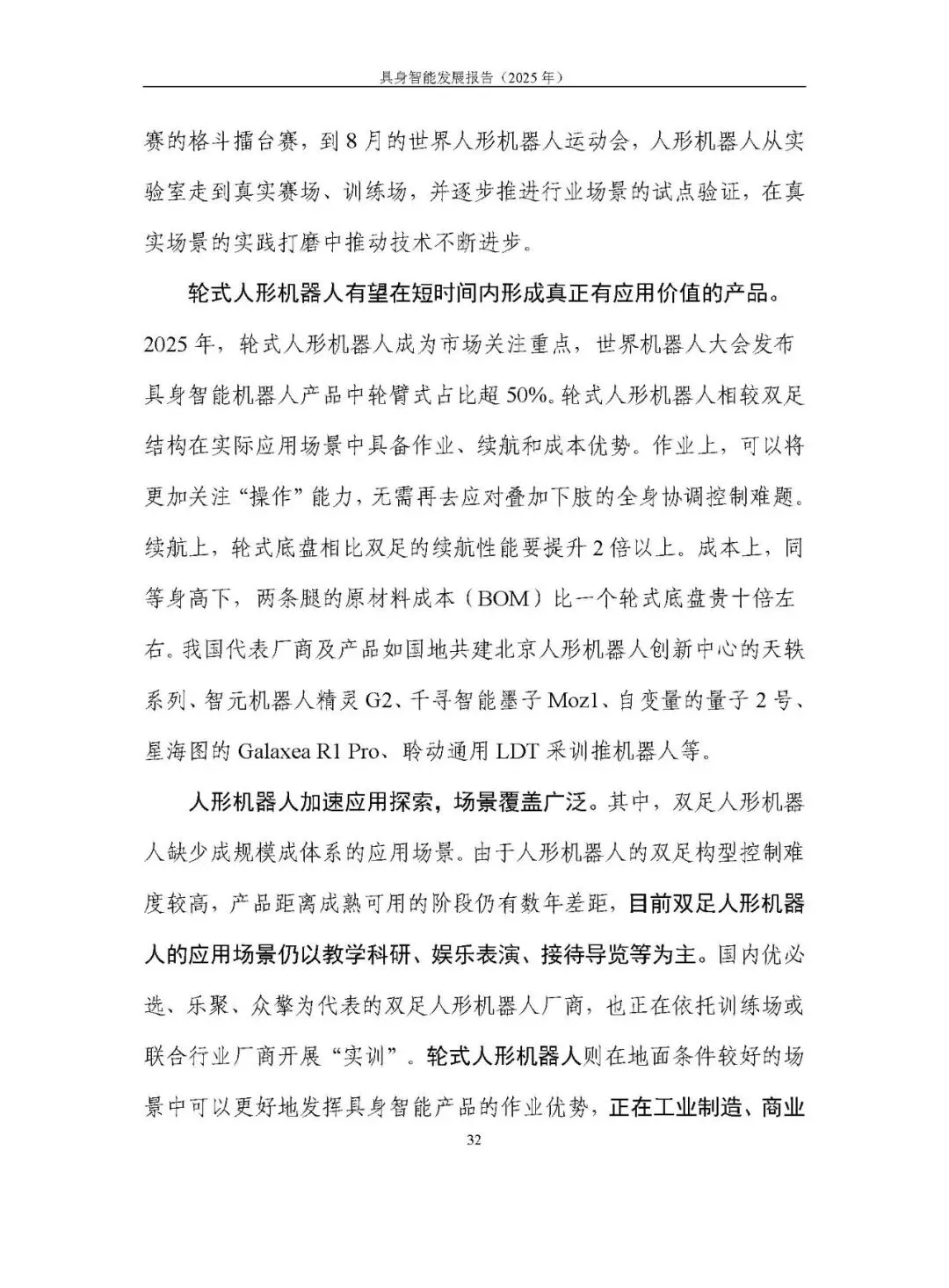 人形机器人(双足 + 轮式)成为热点,运动与作业能力升级,轮式人形机器人在成本、续航等方面优势显著,加速工业、商业场景落地;四足机器狗在复杂地形适应性、交互智能上提升,初步落地商用与消费市场;仿生机器人、智能机械臂等产品持续探索。应用面临作业能力不足、成本高、安全规范滞后等问题。