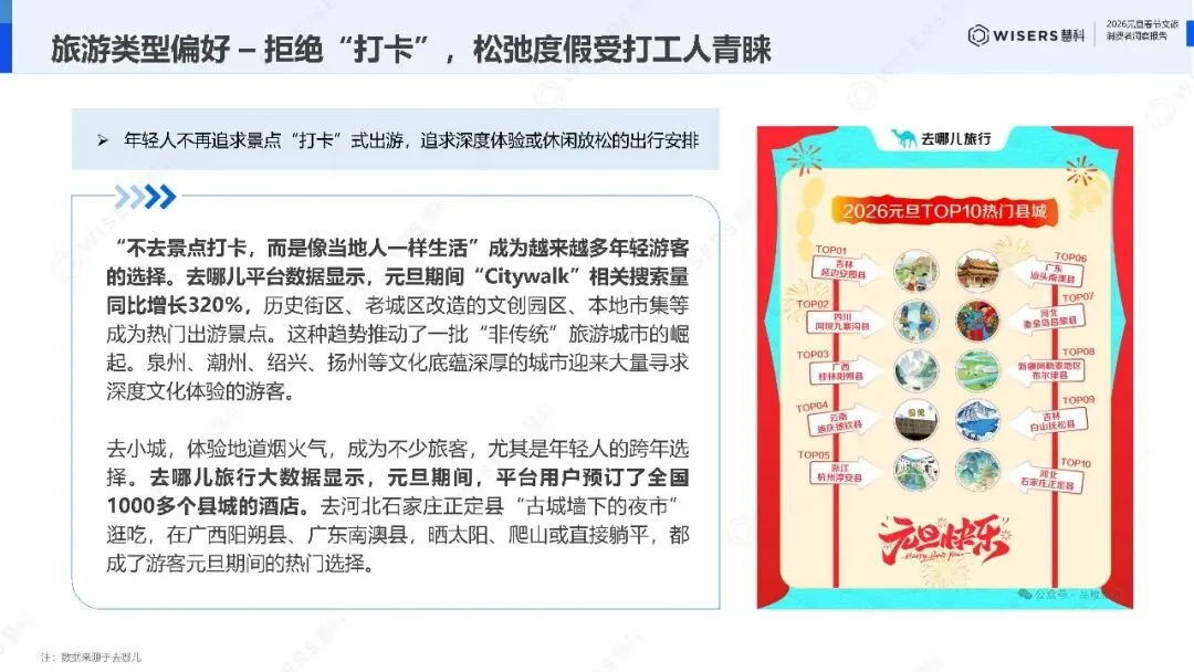 更极致的案例发生在县城。数据显示,元旦期间平台用户预订了全国1000多个县城的酒店。吉林延边安图县、四川阿坝九寨沟县、广西桂林阳朔县位列热门县城前三。当大城市的"网红店"开始同质化,县城的烟火气反而成了稀缺资源。