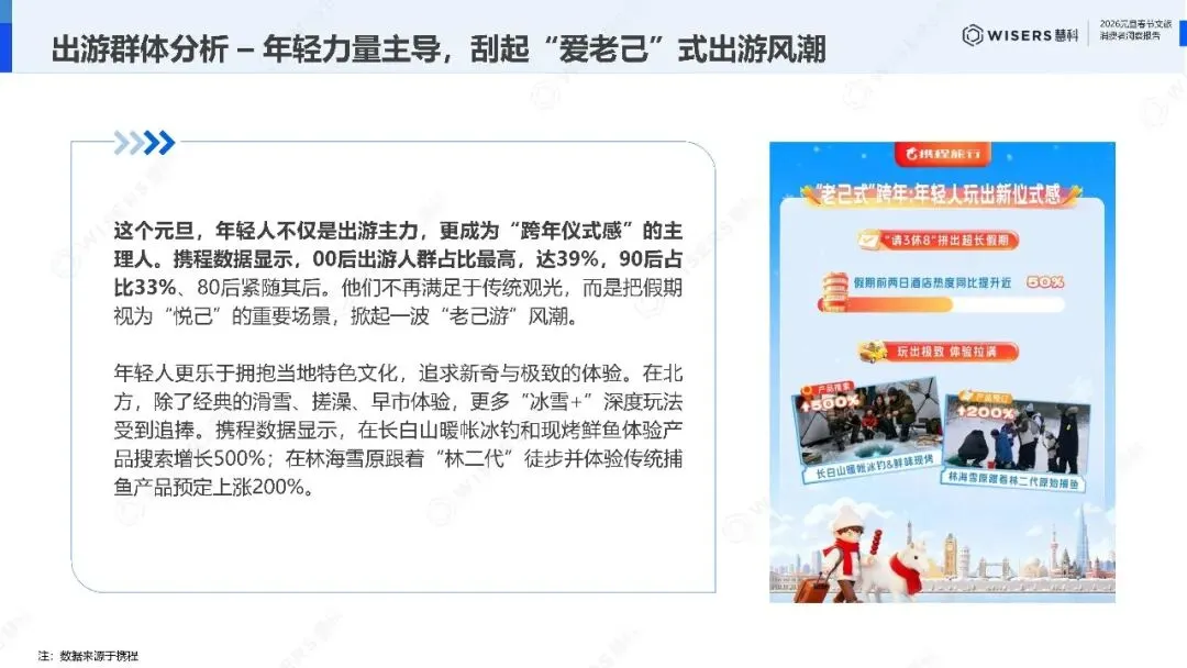 长白山暖帐冰钓和现烤鲜鱼体验产品搜索增长500%,林海雪原跟着"林二代"徒步并体验传统捕鱼的产品预订上涨200%。当"情绪价值"成为增长密码,旅游产品必须提供可分享、可记忆、可讲述的场景。