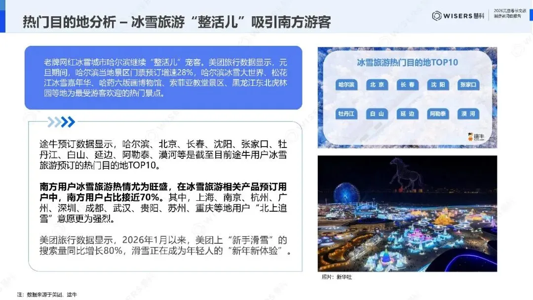 哈尔滨冰雪大世界依然在创造神话。数据显示,元旦期间哈尔滨景区门票预订增速28%,松花江冰雪嘉年华、哈药六版画博物馆、索菲亚教堂景区持续火爆。但真正的市场密码藏在用户画像里:南方用户占比接近70%。上海、南京、杭州、广州、深圳成为"北上追雪"的主力军团。