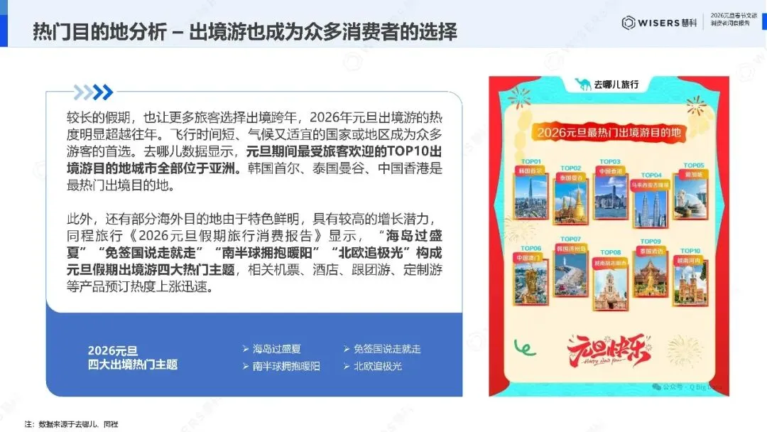 "海岛过盛夏""免签国说走就走""南半球拥抱暖阳""北欧追极光"构成元旦出境游四大主题。相关机票、酒店、跟团游、定制游等产品预订热度上涨迅速。值得注意的是,超长假期进一步激活了出境旅行热情,泰国、澳大利亚、马来西亚、新加坡、韩国、越南、西班牙、新西兰、美国、印度尼西亚成为春节偏爱的长途目的地。