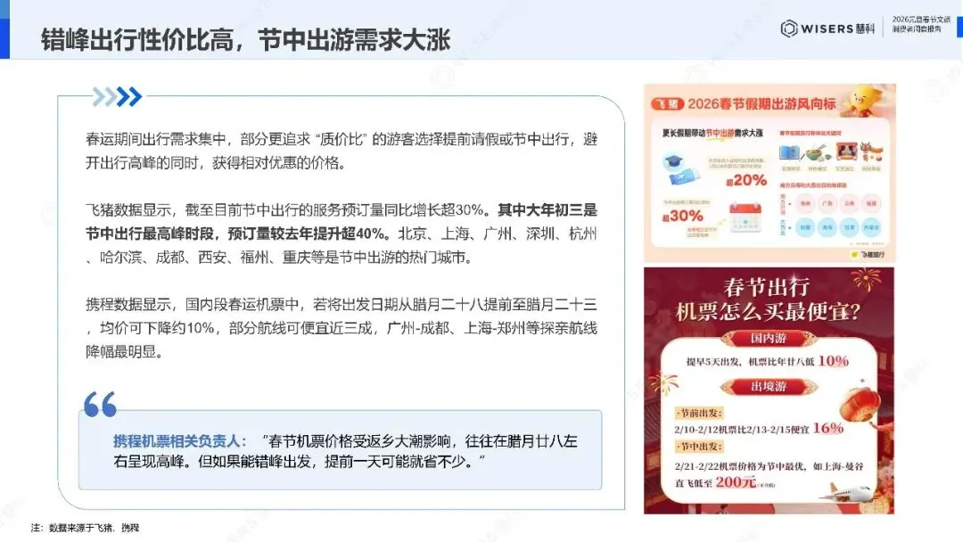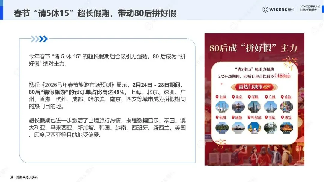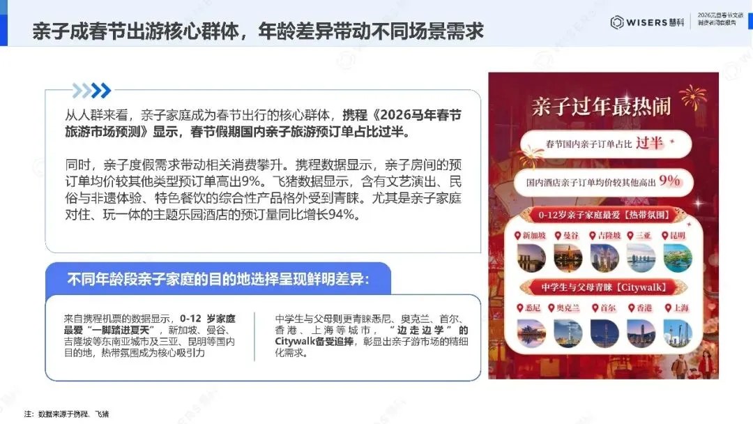 亲子家庭成为春节出行的核心群体,国内亲子旅游预订单占比过半。但需求已经分层:0到12岁家庭最爱"一脚踏进夏天",新加坡、曼谷、吉隆坡、三亚、昆明的热带氛围是核心吸引力;中学生与父母则更青睐悉尼、奥克兰、首尔、香港、上海,"边走边学"的Citywalk备受追捧。亲子房间的预订单均价较其他类型高出9%,含文艺演出、民俗与非遗体验、特色餐饮的综合性产品格外抢手。