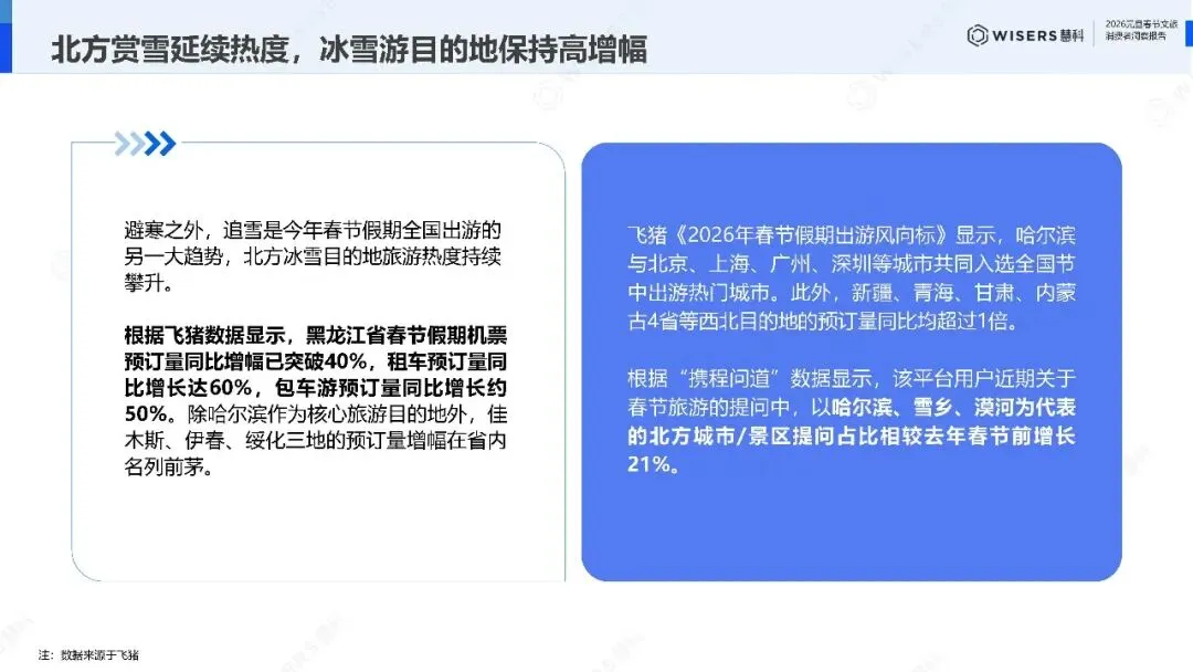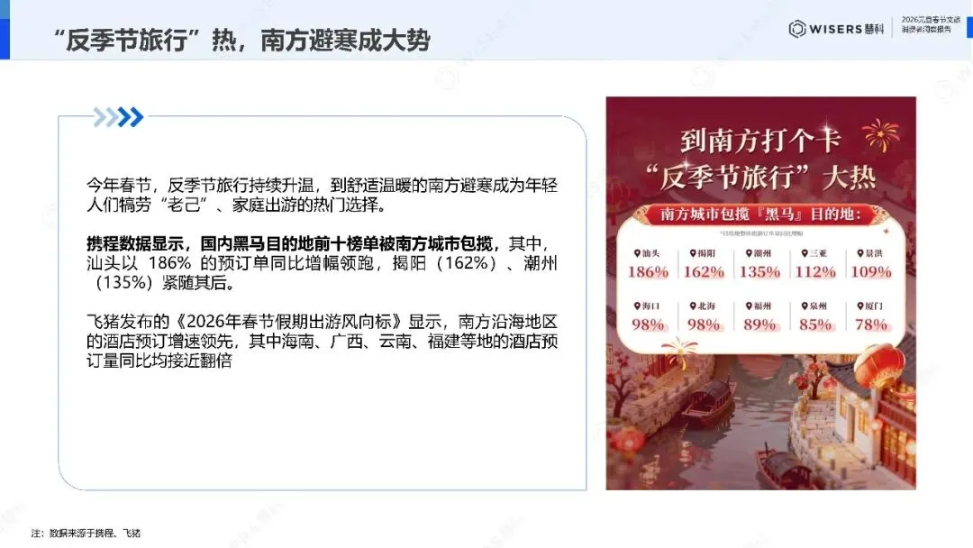 这种南北对流在春节期间将演变为更大规模的消费迁徙。春节预测数据显示,黑龙江省假期机票预订量同比增幅突破40%,租车预订量增长60%。南方沿海城市的酒店预订增速领先全国,海南、广西、云南、福建等地预订量接近翻倍。汕头以186%的预订单增幅领跑全国黑马目的地榜单,然后是揭阳、潮州。这不是简单的季节性波动,而是消费升级的结构性特征。北方要的是体验稀缺性,南方要的是气候舒适性,两者都在为'情绪价值'付费。