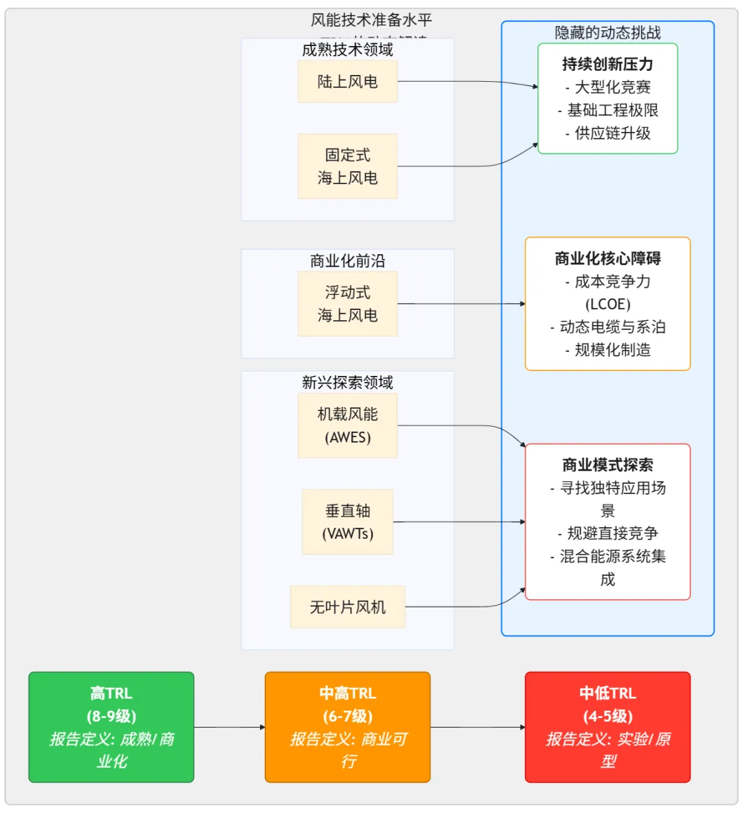 下面的Mermaid图描绘了报告中各项风能技术的TRL评估及其内在的动态挑战,揭示了静态标签下的复杂现实。