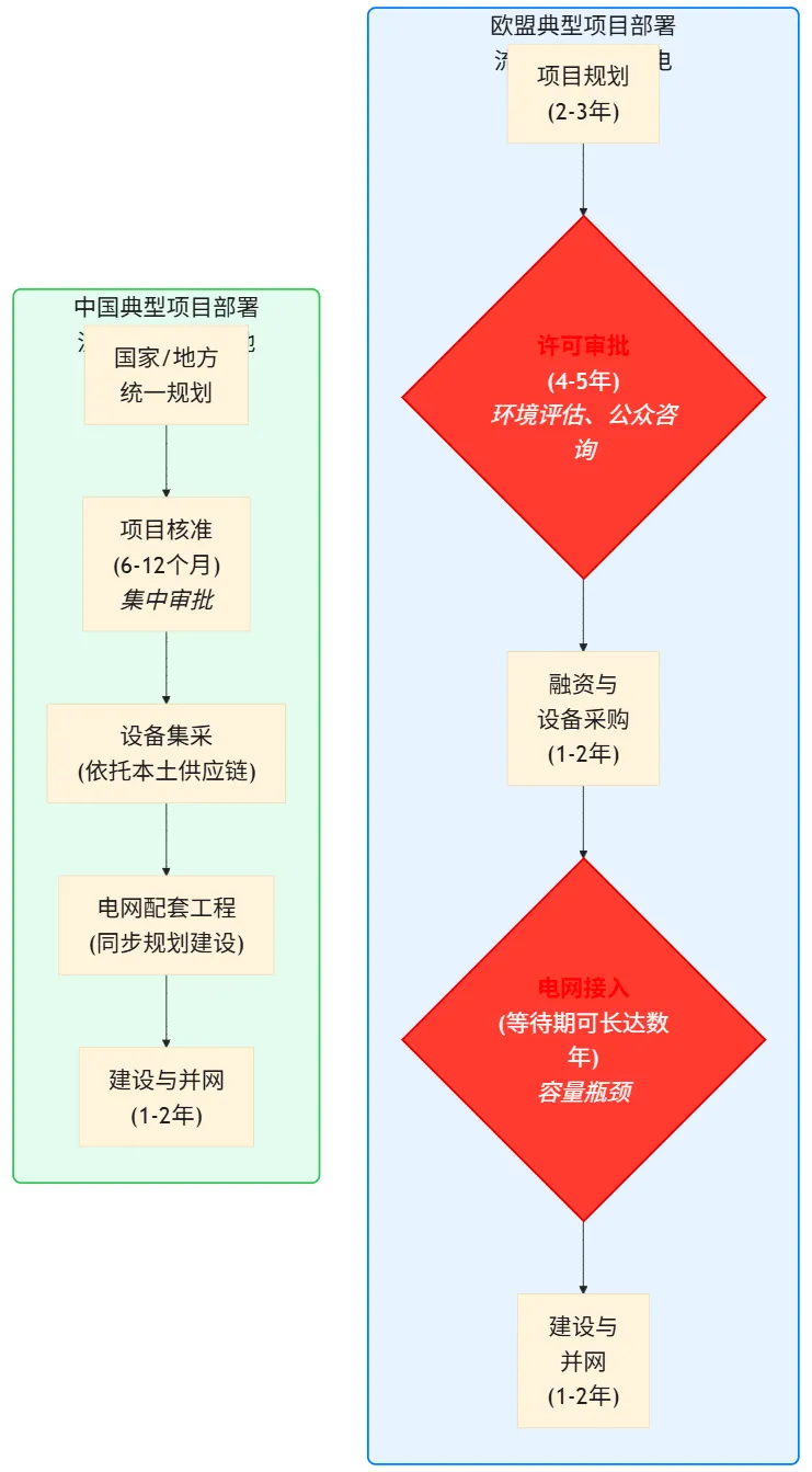下图通过Mermaid流程图,直观对比了中欧两大市场在风电项目部署上的典型路径与关键瓶颈,凸显了两者在效率和面临挑战上的根本差异。