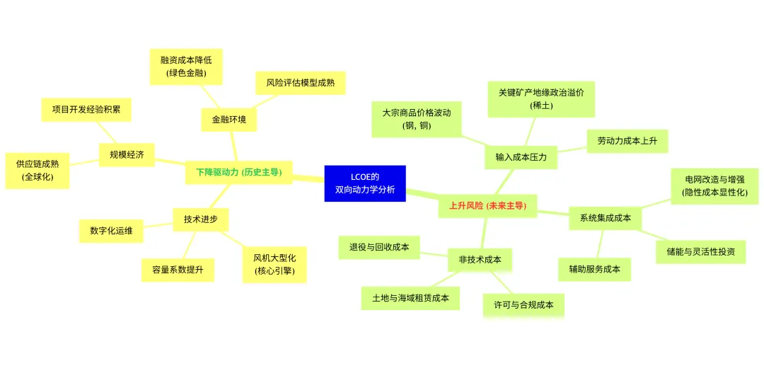 下面的思维导图系统地拆解了LCOE的构成要素,并标示出驱动其下降的积极因素和可能导致其上升的潜在风险,为更全面的成本评估提供了框架。