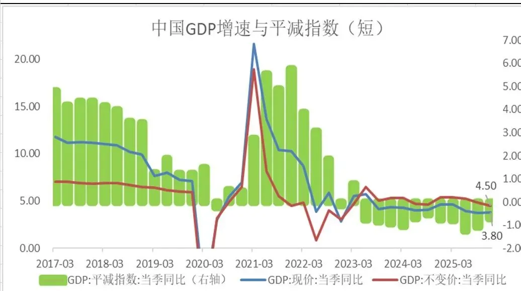 橙线是名义GDP增速,可以理解为“账面”上的增长。它持续走在蓝线下方,反映出物价整体处于低位,名义增长受到价格因素的拖累。