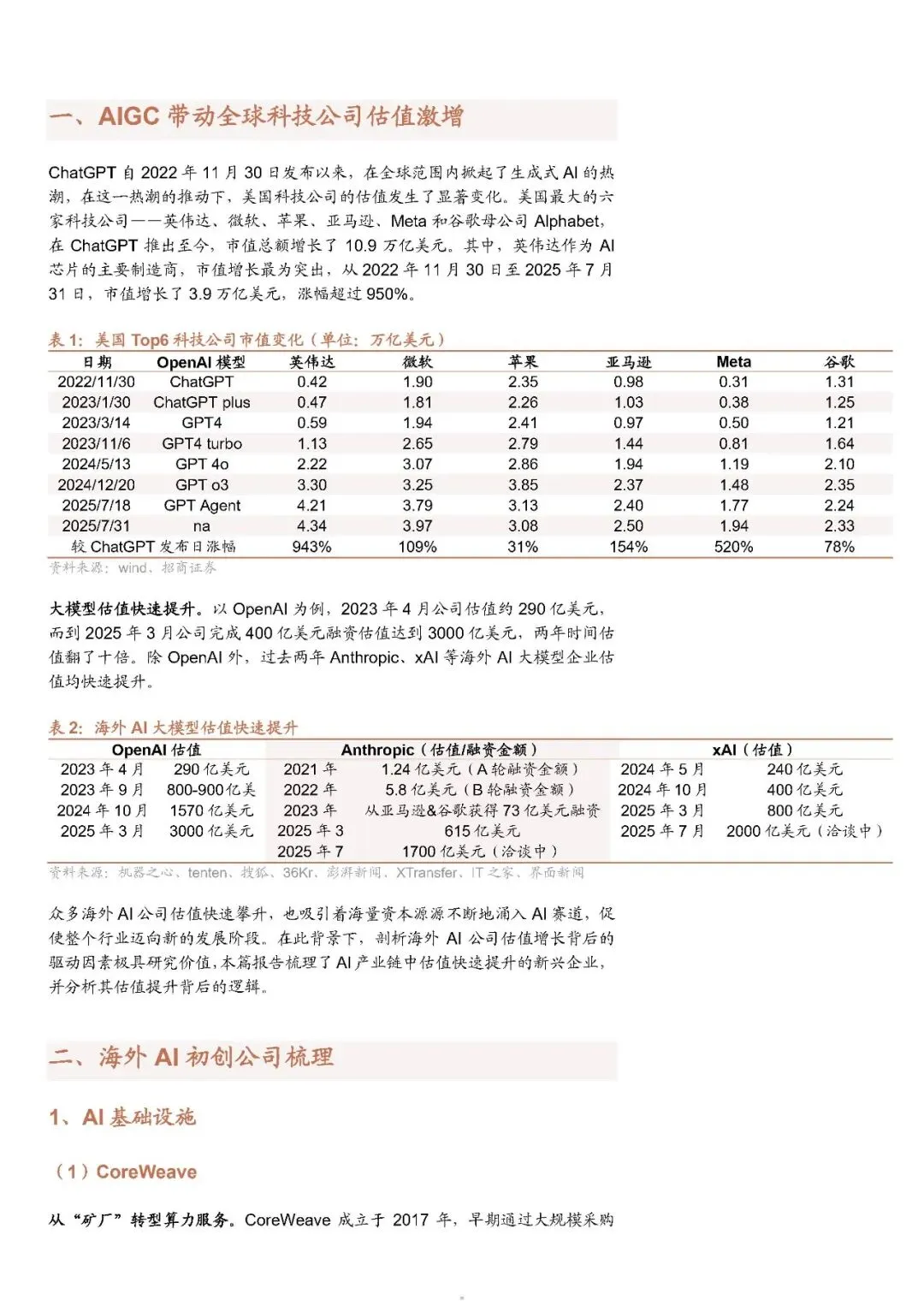 自2022年11月ChatGPT问世以来,生成式AI掀起全球科技革命。美国六大科技巨头(英伟达、微软、苹果、亚马逊、Meta、谷歌)市值累计增长10.9万亿美元,其中英伟达以950%的涨幅独占鳌头,市值暴增3.9万亿美元。这场资本盛宴不仅限于巨头,更在AI产业链各赛道催生出估值火箭般攀升的初创独角兽。从算力租赁到数据标注,从编程工具到精准医疗,一批成立不足10年的企业已跻身百亿美金俱乐部。本报告深度拆解海外AI初创公司的成长逻辑与估值密码。