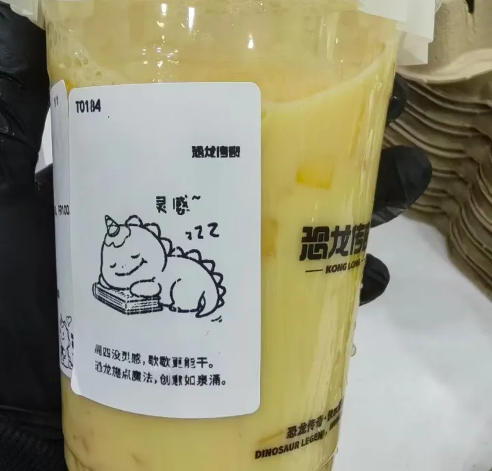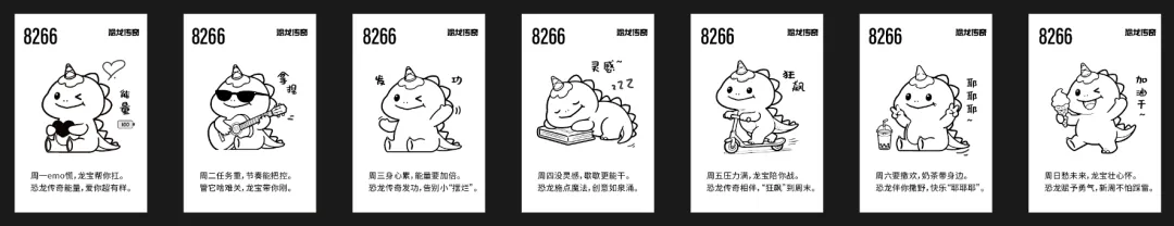 恐龙传奇作为以独特“恐龙”IP出圈的茶饮品牌,在营销方面,深谙此道。单从杯贴上,就用“打工龙系列”杯贴,一周七天的情绪传达玩出新意。用引发共情的情绪语言、图片与消费者搭建情感链接,在日常生活中占据被感知、被记住的触点。