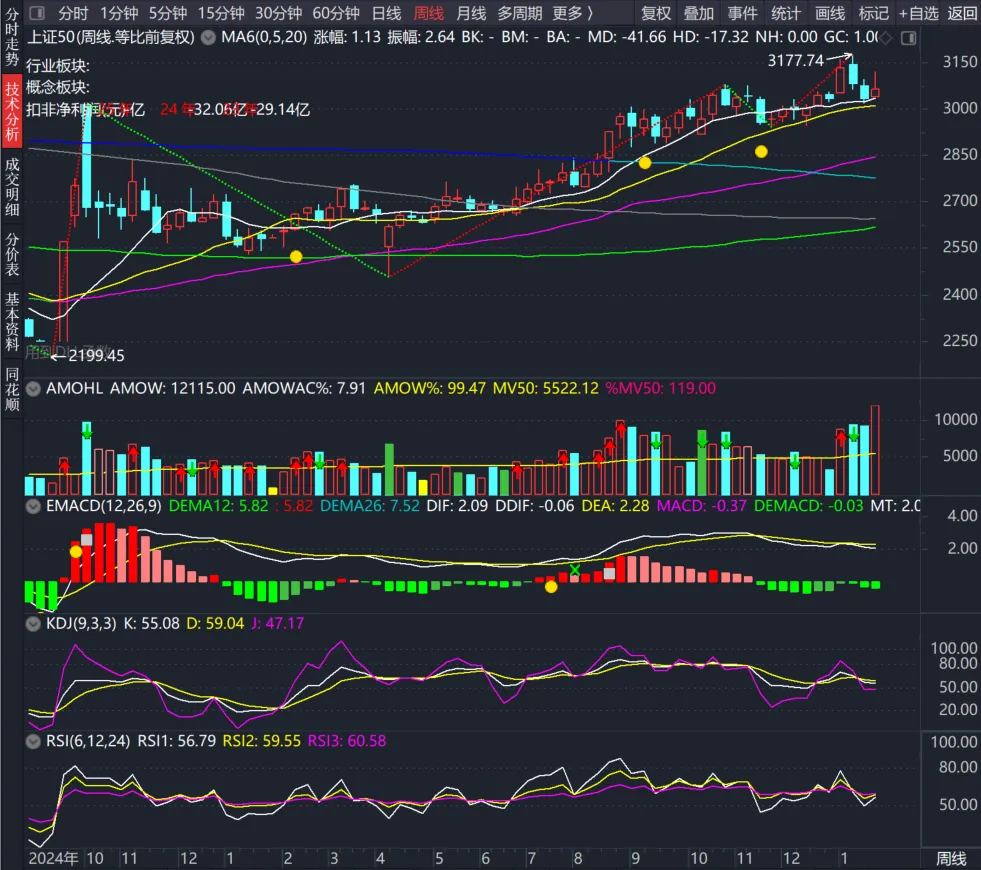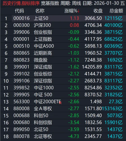 市场综合指数的本周强度排名如下,上证50最强,北证等权最弱。
