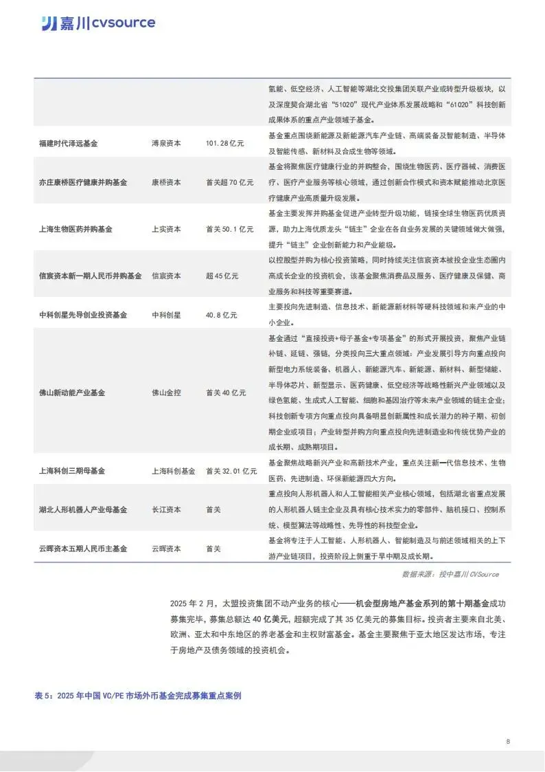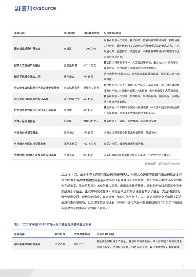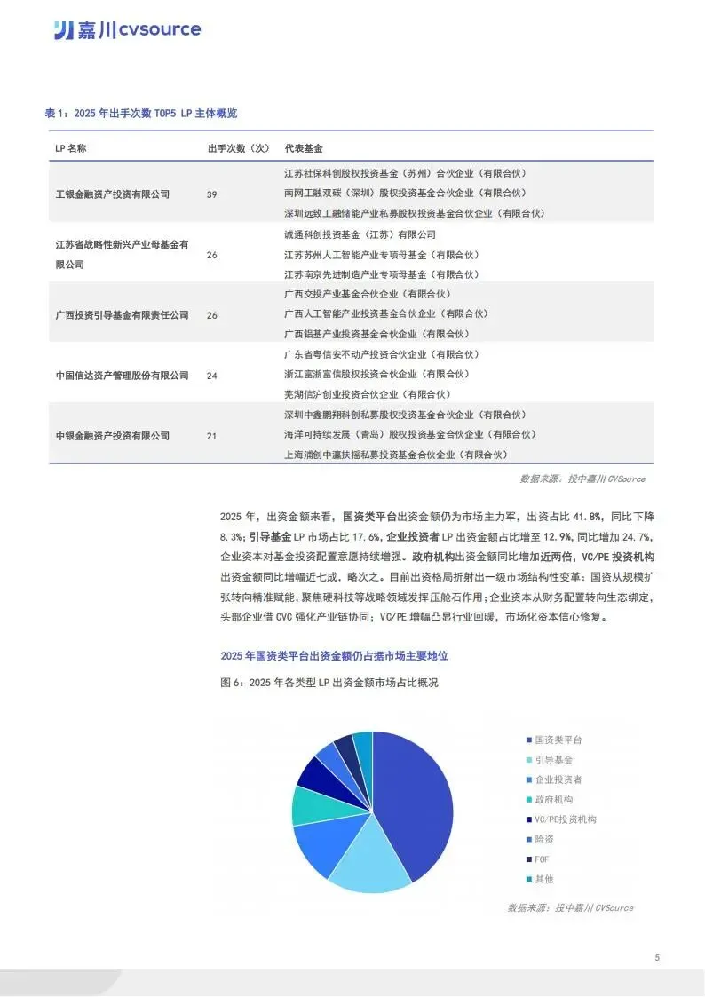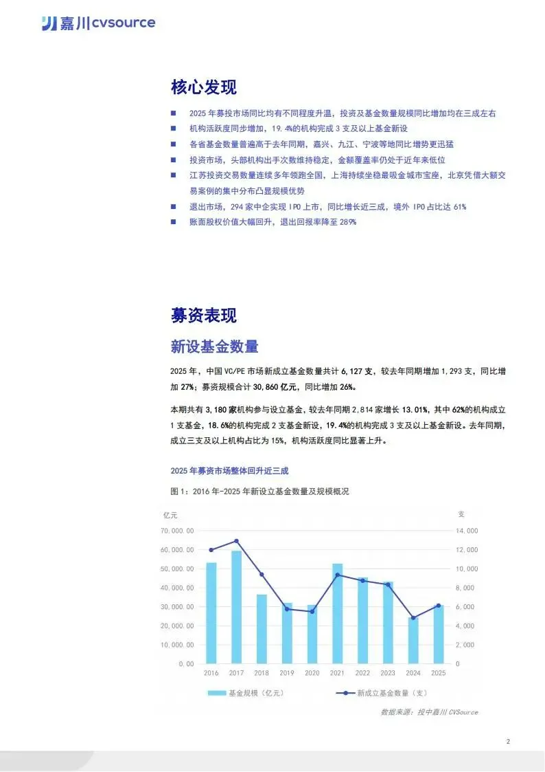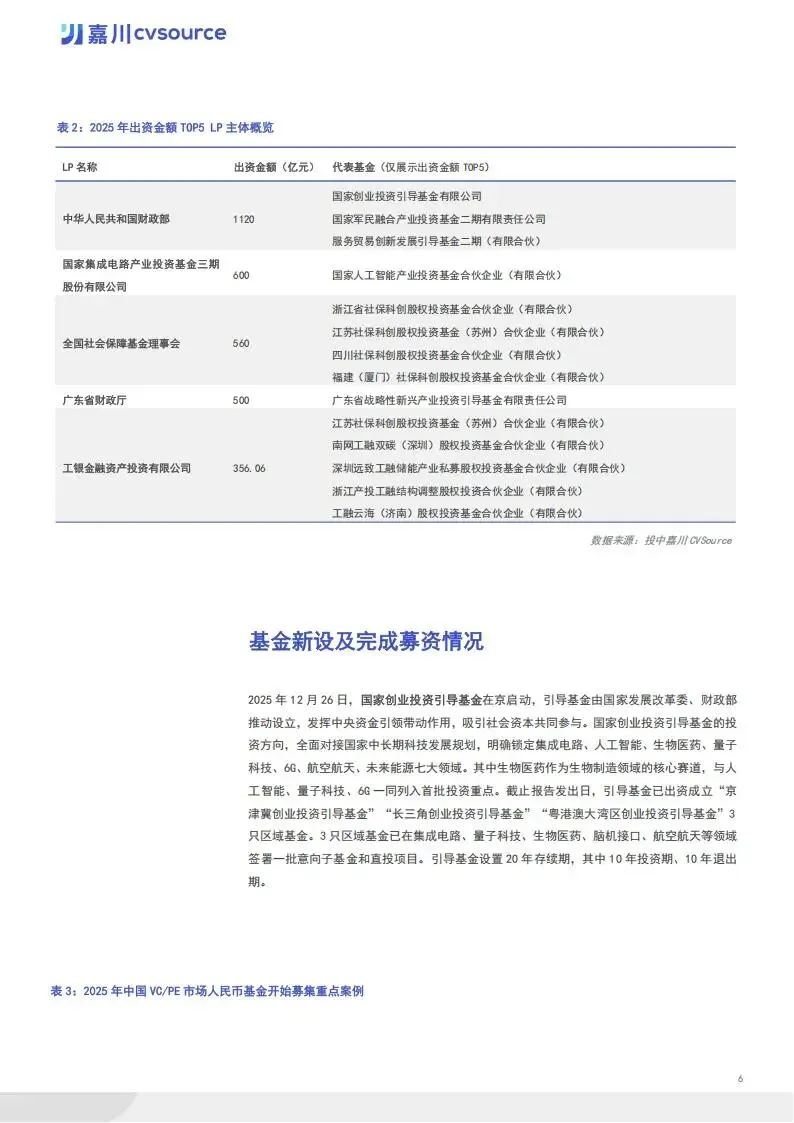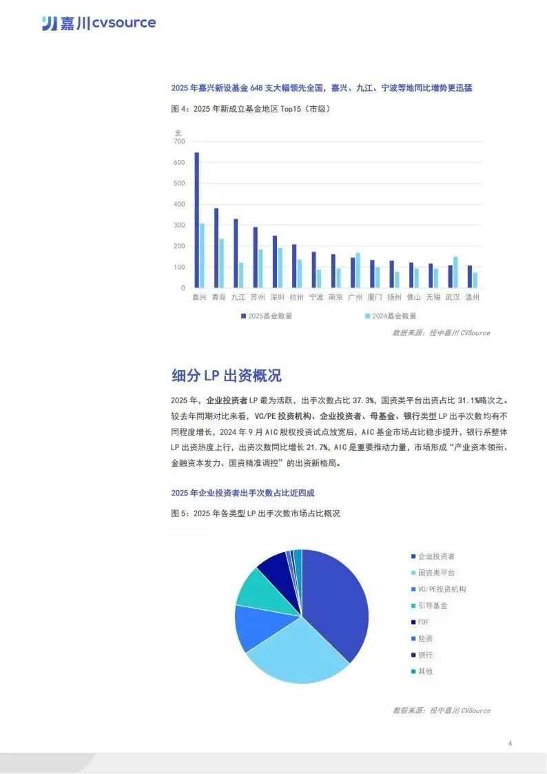 募资端,市场规模稳步增长。全年新成立基金 6127 支,同比增长 27%,募资规模达 30860 亿元,同比增长 26%。机构活跃度显著提升,19.4% 的机构完成 3 支及以上基金新设。地区分布上,浙江省以 1367 支新设基金居首,嘉兴、九江、宁波等地同比增势迅猛。LP 出资格局呈现 “产业资本领衔、金融资本发力、国资精准调控” 特征,企业投资者 LP 出手次数占比 37.3%,国资类平台出资金额占比 41.8%。国家创业投资引导基金等重点基金启动,聚焦集成电路、人工智能等七大前沿领域。