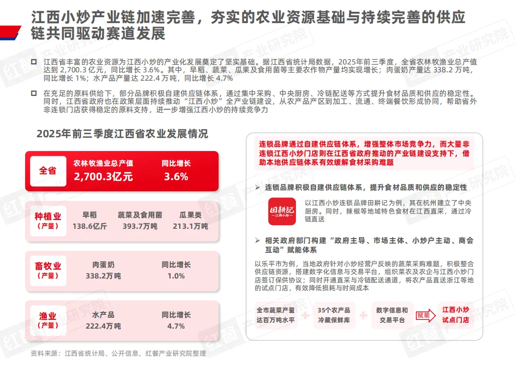 供应链建设:江西农业资源丰富,2025年前三季度农林牧渔业总产值达2700.3亿元,同比增长3.6%。部分品牌已自建中央厨房与冷链体系。