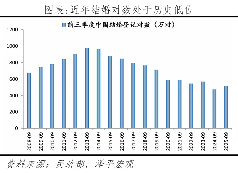 一是近年结婚登记对数不断下降,但2025年前三季度小幅改善,同比增加41万对。