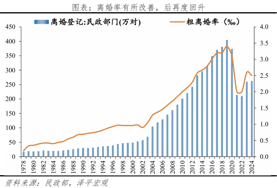 2、离婚率小幅提升。“离婚冷静期”使2021-2022年离婚对数大幅下降。2023年后离婚率连续回升,制度调整短期效果减弱,2025年前三季度离婚登记数同比5.6%。