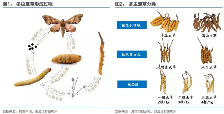 冬虫夏草具备独特生理特性。冬虫夏草的形成大致需要经历五个阶段:夏季蝙蝠蛾产卵,幼虫孵化并以植物根茎为食,幼虫受真菌感染后于土中死亡形成“冬虫”,菌丝在虫体内生长,次年温湿度适宜时菌丝体长出地面形成“夏草”。冬虫夏草主要生长于高海拔的森林草甸或草坪上,根据生长环境主要分为虫体肥大的草原虫草与虫体结实的高山虫草。