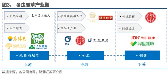 上游采集培育:包括天然采摘和人工培育。传统的天然采摘模式依赖于牧民每年五月一年一次的采挖,生产周期长,采集难度大,价格较高;近年来,人工培育模式快速发展,通过模拟高原环境,将虫草的生长周期缩短至1-2年,活性成分基本一致,可稳定规模化生产,存活率仍待提升,价格偏低。