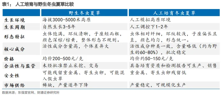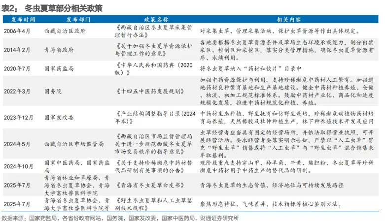 人工培育模式在政策支持下规范发展。由于过量开采(菌源下降)、气候变暖(不利于虫草生长)等原因,我国冬虫夏草天然产量稀缺性增强,全国野生冬虫夏草年产量从20世纪90年代的200吨降至近年约80吨。2019年以来,政策持续引导中药材,尤其珍惜濒危中药材的研发培育和替代品研制;规范市场交易秩序,2025年编制《野生冬虫夏草和人工虫草鉴别技术规程》团体标准,聚焦形态特征、气味、技术指标三大核心鉴别方法,为市场监管提供科学依据,推动产业标准化升级。