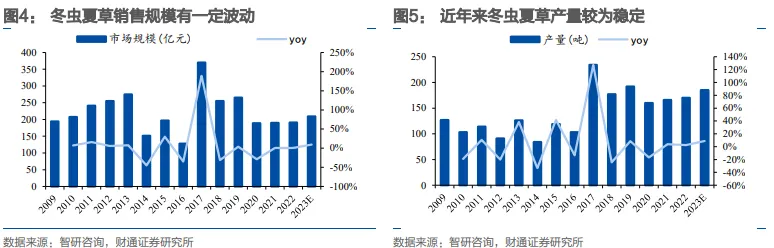 冬虫夏草供给逐渐稳定。1)据智研咨询,2023年,中国冬虫夏草行业市场规模超过200亿元。2)据中研网,2023年冬虫夏草行业市场规模达到382亿元,同比+12.4%,其中野生冬虫夏草占比74.6%。从消费场景来看,自用消费占比为55%,礼品消费占比为35%,投资消费占比为10%。