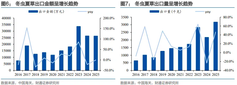 冬虫夏草出口量整体呈现增长趋势。伴随“一带一路”政策实施以及中医药行业国际市场的逐步开拓,中国冬虫夏草的出口量和出口额整体呈增长趋势,从出口目的地来看,我国冬虫夏草主要出口至日本、新加坡、中国澳门、泰国、新西兰、美国、加拿大等地。2020至2025年,冬虫夏草出口额从1.2亿元增长至2.6亿元,CAGR为17.5%;出口量从1438kg增长至3172kg,CAGR为17.1%。