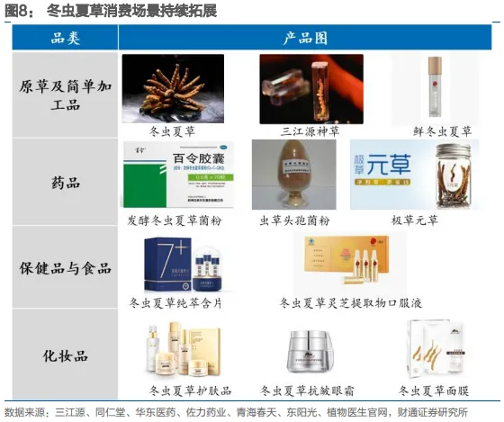 冬虫夏草应用领域广泛,产品形态丰富。伴随健康意识提高,冬虫夏草的消费场景和需求持续拓展,不仅作为原草及简单加工品,更作为功效成分在药品、保健品、化妆品等品类中添加。销售渠道亦持续拓展,比如线下渠道通过提供品鉴、检测演示、跨界联名等方式增强服务,线上渠道通过私域流量、直播带货等方式加强内容(虫草鉴别、虫草食谱等)营销,增加转换和复购。