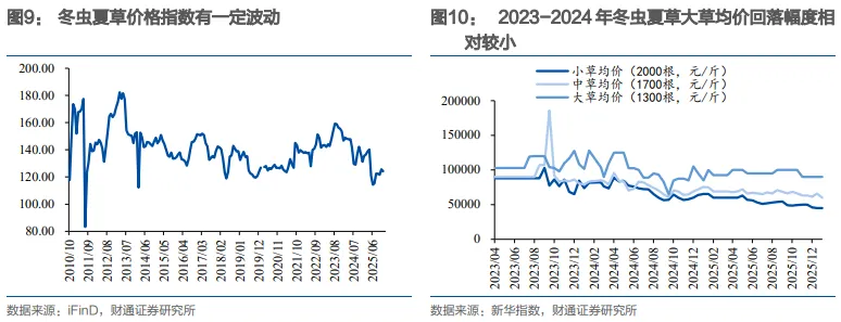 2021年至今:价格整体趋于稳定。冬虫夏草供应量逐步稳定,由于需求和稀缺性驱动,核心产区野生冬虫夏草价格再度上涨,2023年冬虫夏草(2000条)价格再回到21-22万元/千克;2024-2025年,小草和中草价格有所回落。