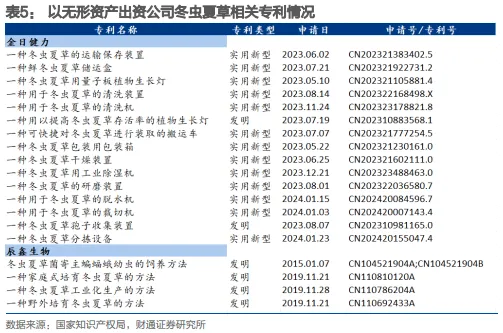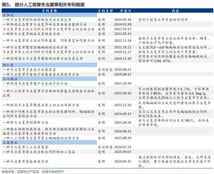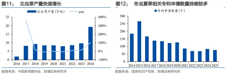 技术进步为冬虫夏草行业发展带来新的机遇。冬虫夏草相关专利申请数量在2015年达到顶峰,一直处于较高水平。1)在我国,允许食用和药用、具备规模化栽培条件的虫草类子实体包括冬虫夏草、广东虫草、蝉花虫草及蛹虫草(北虫草),在2009/2013/2021年,蛹虫草/广东虫草/蝉花虫草分别获批“新食品原料”,推动虫草产业延伸发展。2)冬虫夏草的采收甄选、检测、生产工艺进步和技术应用,推动产品加工效率提升、种类丰富、功效提升。3)蝙蝠蛾饲料制备、幼虫养殖、分生孢子、侵染幼虫、(高密度)培育子实体等环节技术研发持续推进,人工培育冬虫夏草专利技术逐步成熟,人工配置存活率提升,成本优化,活性成分与野生虫草基本相近,规模化人工冬虫夏草生产持续推进,出现家庭式林下种植、大棚种植、产地野外原地增产、合作种植等多种生产经营方式。
