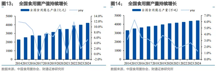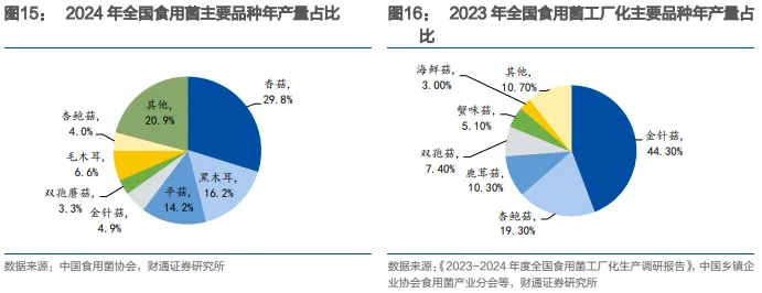 食用菌市场规模持续增长。依据中国食用菌协会,2019-2024年,全国食用菌产量自3934万吨增长至4391万吨,CAGR为2.2%;全国食用菌产值自3127亿元增长至4176亿元,CAGR为6.0%。2024年,产量排名前五的品种包括香菇(29.8%)、黑木耳(16.2%)、平菇(14.2%)、毛木耳(6.6%)、金针菇(4.9%)。产量靠前的部分品种是工厂化栽培,据中国乡镇企业协会食用菌产业分会,2023年全国食用菌工厂化产量排名前五品种包括金针菇(44.30%)、杏鲍菇(19.3%)、鹿茸菇(10.3%)、双孢菇(7.40%)、蟹味菇(5.10%)。