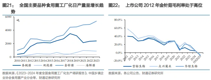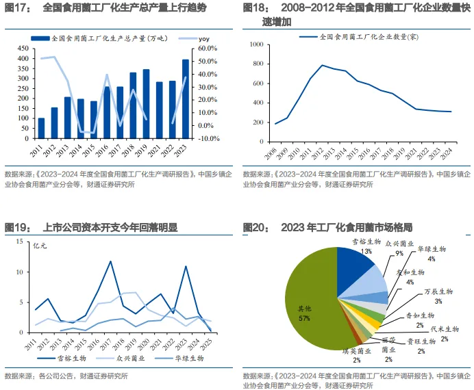 2017年后,各品种和各企业的发展出现分化。据中国乡镇企业协会食用菌产业分会,2018-2023年,杏鲍菇和海鲜菇工厂化日产量有所回落,CAGR分别为-7.2%和-2.8%;双孢菇和金针菇工厂化日产量持续提升,CAGR分别为14.7%和3.8%,其中金针菇产能过剩明显,2024年,众兴菌业金针菇业务毛利率已回落至5.0%。头部企业工艺、规模、资金、营销优势逐步稳固,市场格局基本稳定,2024年雪榕生物/众兴菌业/华绿生物日产量市占率达到13%/9%/4%。