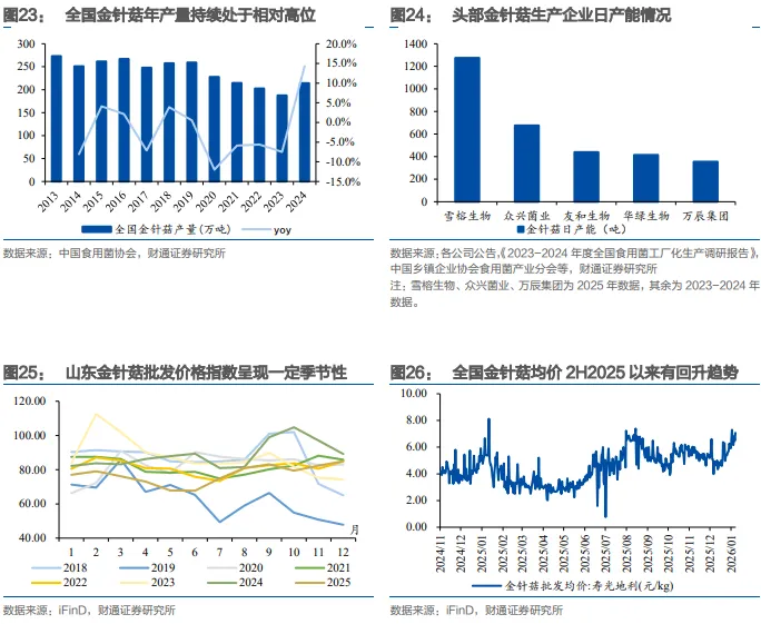 金针菇竞争格局稳定,产能收缩价格底部企稳。金针菇是食用菌工厂化快速增长,工厂化规模最大的品种,依据中国乡镇企业协会食用菌产业分会数据,2023年工厂化日产量超5300吨。龙头企业规模快速扩张,当前市占率已经处于较高水平,据中国乡镇企业协会食用菌产业分会数据测算,头部三家市占率超过40%。近年来,金针菇产能持续处于过剩情况,金针菇价格处于历史相对低位,行业整体亏损;头部公司为长期可持续发展,缩减资本开支,收缩产能,如2025年上半年众兴菌业子公司陕西高科金兴更新改造成冬虫夏草产线,带动公司产能从780吨/天降至675吨/天。2025年下半年,金针菇价格底部出现回暖趋势。