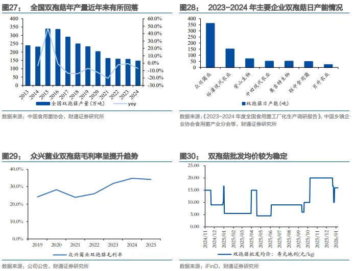 双孢菇产能稳定,盈利稳定在较高水平。双孢菇是工厂化种植的代表品种之一,依据中国乡镇企业协会食用菌产业分会数据,2023年工厂化日产量达到867吨。由于对于温度、湿度、二氧化碳浓度等环境控制精准度要求高,采用多次发酵技术制备培养基,采后保鲜要求高等,双孢菇生产进入壁垒较高。龙头企业竞争优势明显,市场份额较高,依据中国乡镇企业协会食用菌产业分会数据测算,众兴菌业2023-2024年工厂化日产能占比达到40%。行业整体供应和行业格局较为稳定,价格和盈利能力维持在较高水平,2024年,众兴菌业双孢菇业务毛利率达到34.8%。