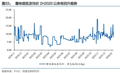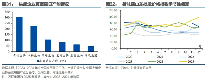 供应端存压力,需求端向好。真姬菇,又称蟹味菇、海鲜菇,需求端,家庭消费和中高端餐饮场景需求较多,伴随冷链物流和工厂化种植技术发展,市场需求持续较快增长;供应端,近几年头部企业生产规模基本均有所扩张,依据中国乡镇企业协会食用菌产业分会数据,2023年工业化日产能达349吨,行业供应相对充分,压缩盈利空间。伴随头部企业缩减资本开支,2H2025真姬菇价格有回升趋势。