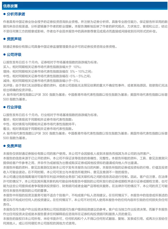 本文节选自财通证券股份有限公司(简称“财通证券”)已公开发布的研究报告,如需了解详细内容,请具体参见财通证券发布的完整版报告。本微信号推送的内容仅面向财通证券客户中的专业投资者,若您并非该类客户,请勿订阅、转载或使用本微信号的信息。本微信号建设受限于难以设置访问权限,财通证券不会因您订阅本微信号的行为或者收到本微信号推送消息而视为我们的当然客户。 本微信号旨在及时分享研究成果,并不是我们的研究报告发布平台。所载资料与我们正式发布的报告相较存在延时转发的情况,并可能因报告发布日之后的情势变化而不再准确或失效,且本微信号不承担更新推送信息或另行通知的义务,后续更新信息请以财通证券研究正式发布的研究报告为准。 在任何情况下本微信号所推送信息或所表述的意见并不构成对任何人的投资建议,投资者不应单纯依靠所接收我们推送的信息而取代自身的独立判断,必须充分了解各类投资风险,自主做出决策并自行承担投资风险。为避免投资者不当使用所载资料,提示应关注以下事项:(1)本微信号所载资料涉及的盈利预测、投资评级、目标价等,均是基于特定的假设条件、特定的评级标准、相对的市场基准指数而得出的中长期价值判断,不涉及对具体证券或金融工具在具体时点的判断。(2)本微信号所载资料涉及的数据或信息均来源皆被财通证券认为可靠,但财通证券不对前述数据或信息的准确性或完整性做出任何保证,报告内容亦仅供参考。(3)不同时期,财通证券可能会依据不同的假设和标准、采用不同的分析方法而口头或书面发表与本资料意见不一致的市场评论或投资观点。 为控制投资风险,投资者应仔细阅读本资料所附的各项声明、信息披露事项及风险提示。由于上述所列风险提醒事项并未囊括不当使用本资料所涉的全部风险,投资者必要时应寻求专业投资顾问指导。 本微信号版权仅为财通证券股份公司所有,并保留一切法律权利。未经事先书面许可,任何机构和个人不得以任何形式翻版、转载和发表。