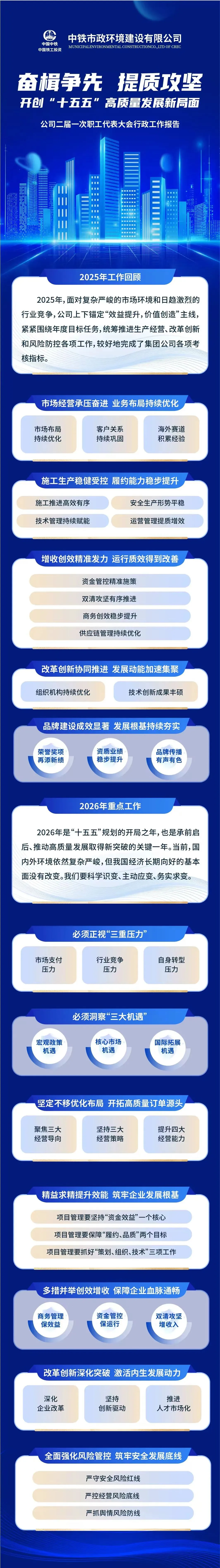 1月31至2月1日,中铁市政环境公司在沪召开二届一次职工代表大会。公司总经理、党委副书记郑田杨作了题为《奋楫争先 提质攻坚 开创“十五五”高质量发展新局面》的行政工作报告,全面总结了2025年重点工作,客观分析了企业存在的问题短板,综合研判了企业发展面临的机遇挑战,明确了2026年奋斗目标,并对重点工作进行部署。