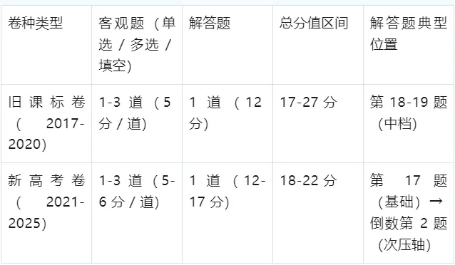 成熟阶段(2024-2025) :分值占比与课标参考课时占比(约 18%)基本匹配,新高考 II 卷稳定在 22 分,解答题固定为倒数第 2 题(次压轴),形成 “基础题 + 中档综合题 + 压轴创新题” 的层级结构。