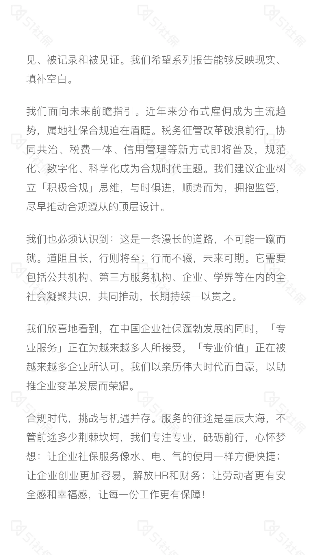 我们欣喜地看到,在中国企业社保蓬勃发展的同时,「专业服务」正在为越来越多人所接受,「专业价值」正在被越来越多企业所认可。我们以亲历伟大时代而自豪,以助推企业变革发展而荣耀。合规时代,挑战与机遇并存。服务的征途是星辰大海,不管前途多少荆棘坎坷,我们专注专业,砥砺前行,心怀梦想:让企业社保服务像水、电、气的使用一样方便快捷;让企业创业更加容易,解放HR和财务;让劳动者更有安全感和幸福感,让每一份工作更有保障!