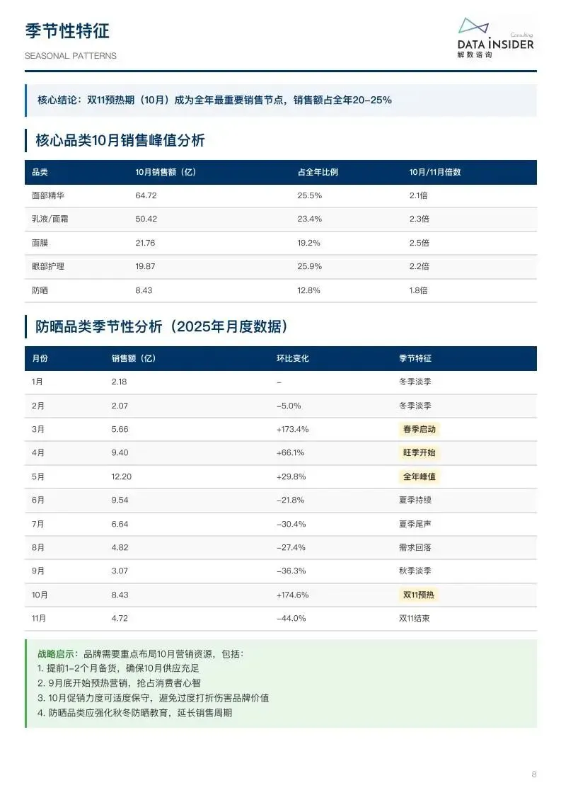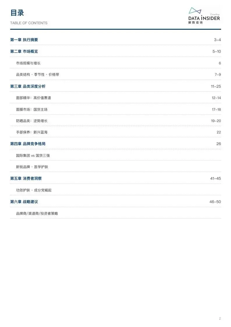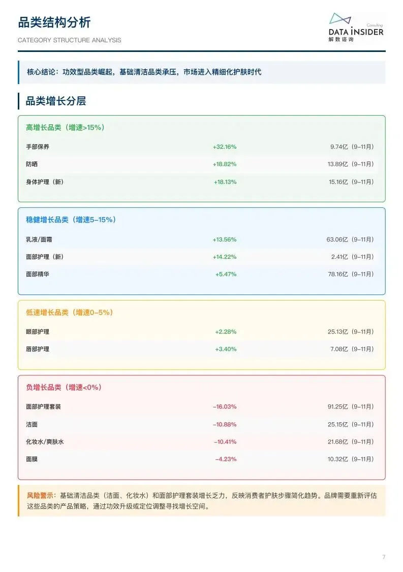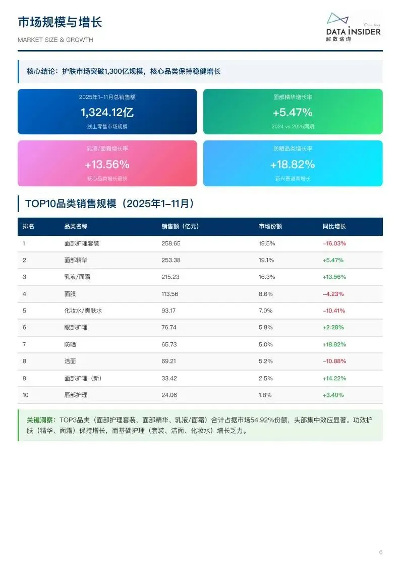 2024-2025 年中国护肤品线上零售市场规模达 1324.12 亿元,行业进入品牌集中化、功效专业化、国货高端化新阶段。市场头部效应显著,TOP3 品类(面部护理套装、面部精华、乳液 / 面霜)合计占据 54.92% 份额,品牌数量下降 26%-34%,而头部品牌 SKU 增长 12%-17%,中小品牌加速出局。