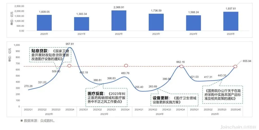 在闭门会上,孟令成先生指出,由于得到设备更新、县域医共体等配套政策及国家财政资金的支持,2025年公立医疗机构招投标市场规模超预期复苏,整体达1937.61亿元,全年市场同比增长超24%,已逼近2022年市场规模水平。