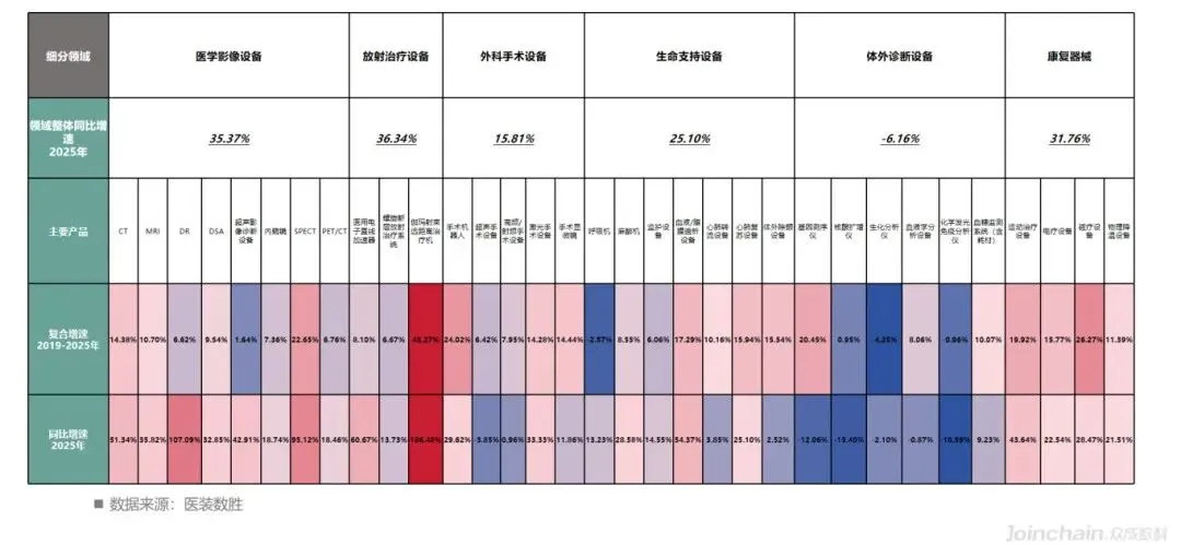 医学影像、放疗设备、康复设备三大领域市场增速表现出众,生命支持设备如呼吸机、麻醉机、监护仪等市场规模增速也恢复正增长。