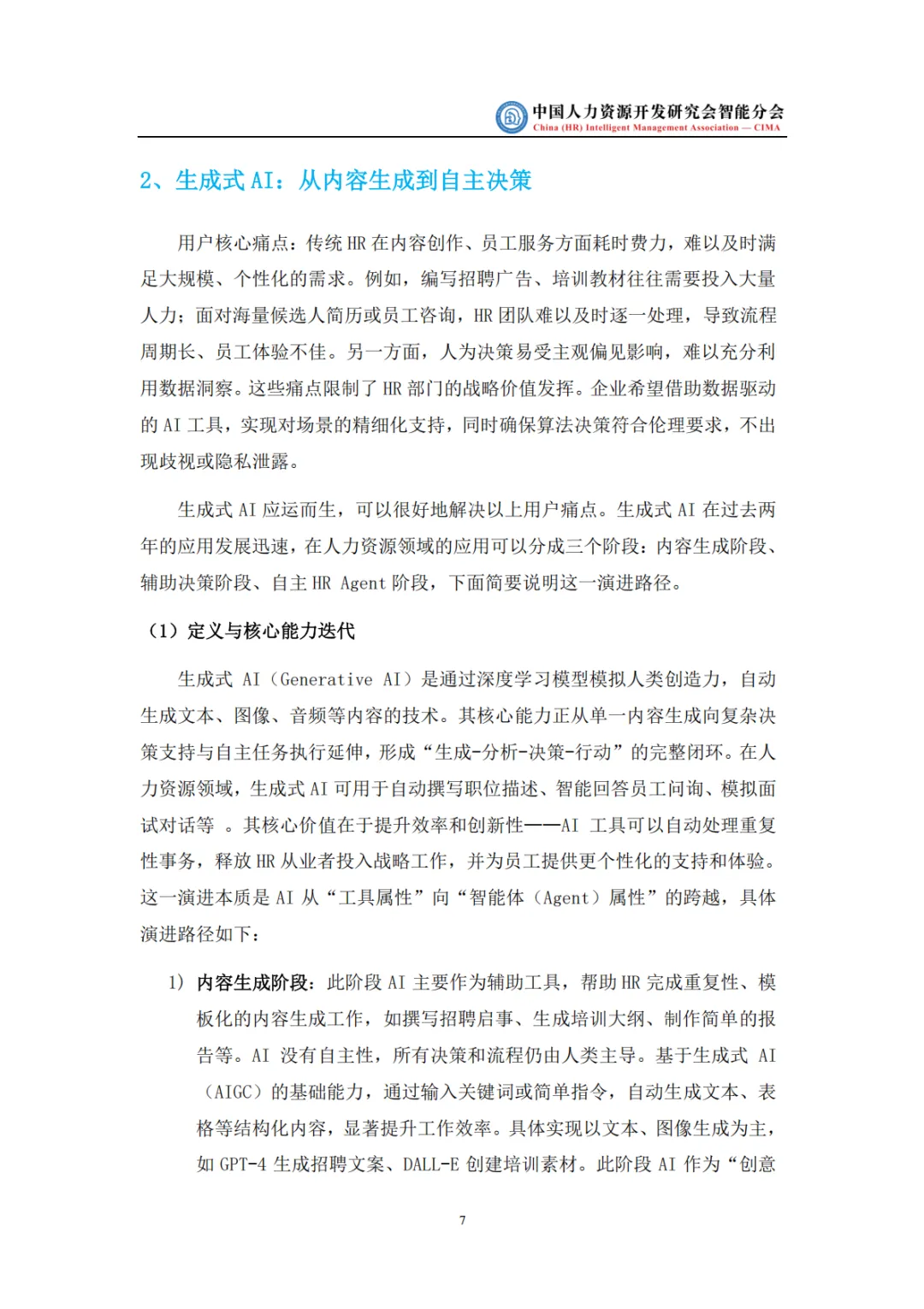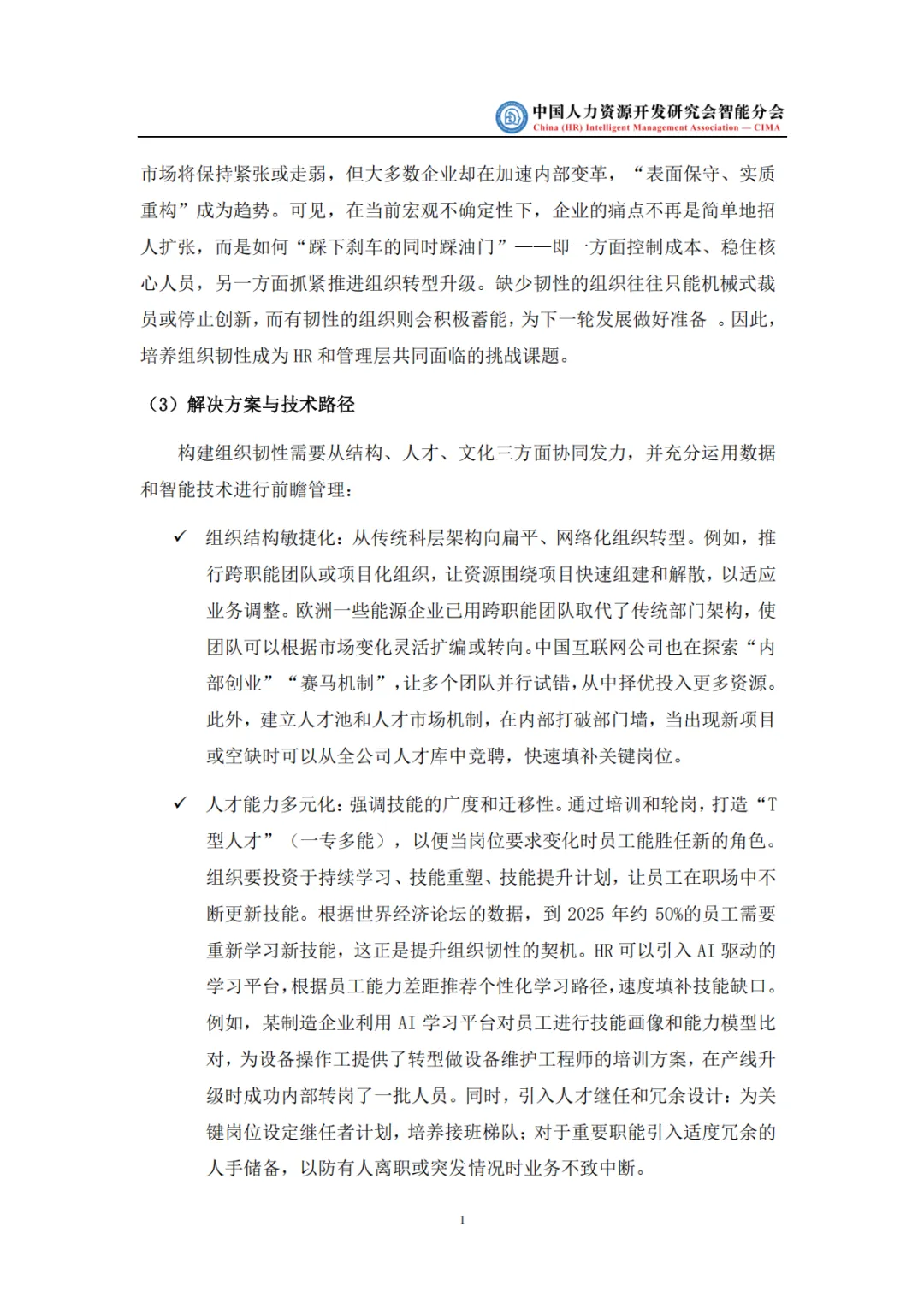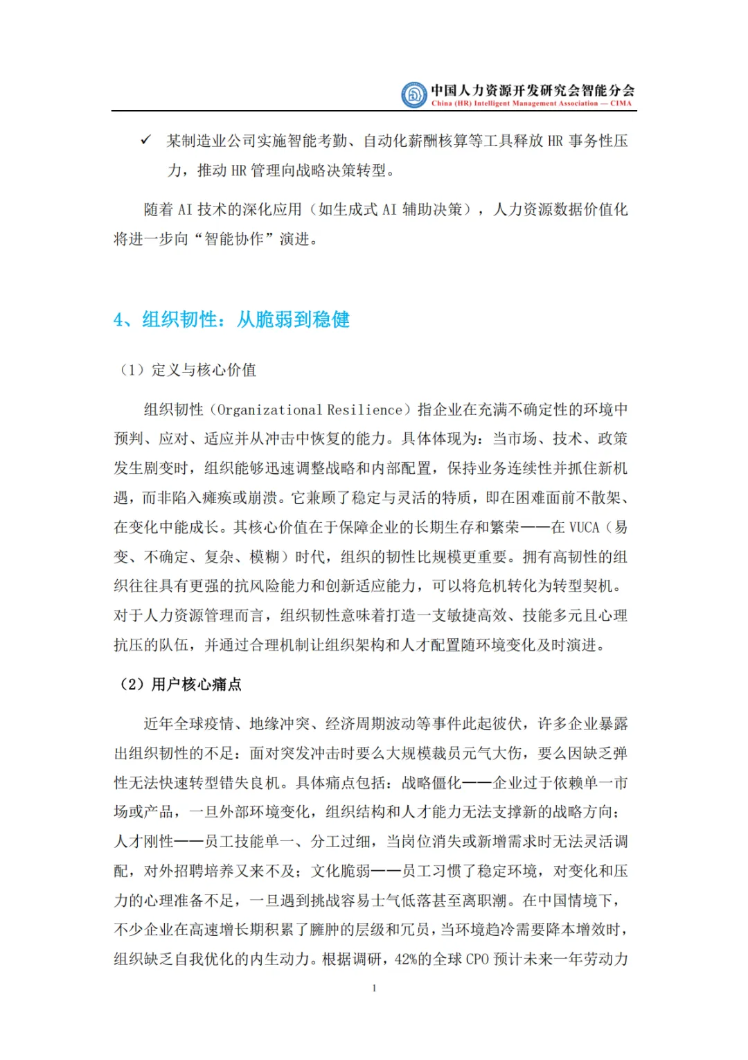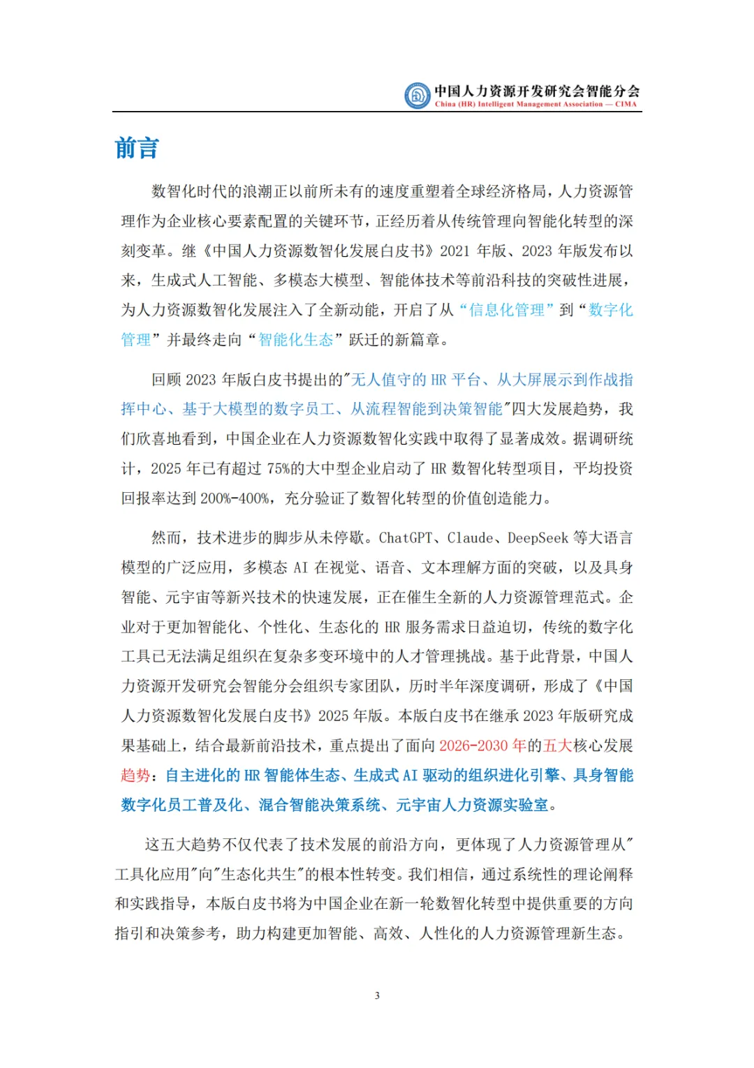 然而,技术进步的脚步从未停歇。ChatGPT、Claude、DeepSeek 等大语言模型的广泛应用,多模态 AI 在视觉、语音、文本理解方面的突破,以及具身智能、元宇宙等新兴技术的快速发展,正在催生全新的人力资源管理范式。企业对于更加智能化、个性化、生态化的 HR 服务需求日益迫切,传统的数字化工具已无法满足组织在复杂多变环境中的人才管理挑战。基于此背景,中国人力资源开发研究会智能分会组织专家团队,历时半年深度调研,形成了《中国人力资源数智化发展白皮书》2025 年版。本版白皮书在继承 2023 年版研究成果基础上,结合最新前沿技术,重点提出了面向 2026-2030 年的五大核心发展趋势:自主进化的 HR 智能体生态、生成式 AI 驱动的组织进化引擎、具身智能数字化员工普及化、混合智能决策系统、元宇宙人力资源实验室。