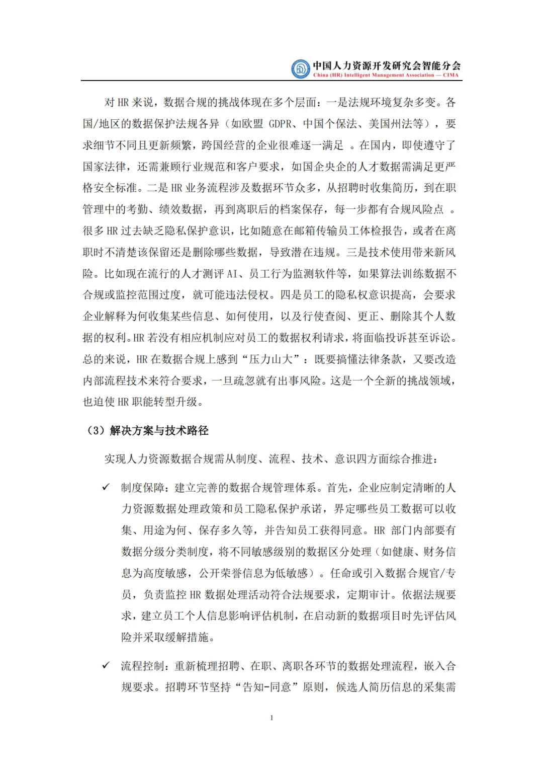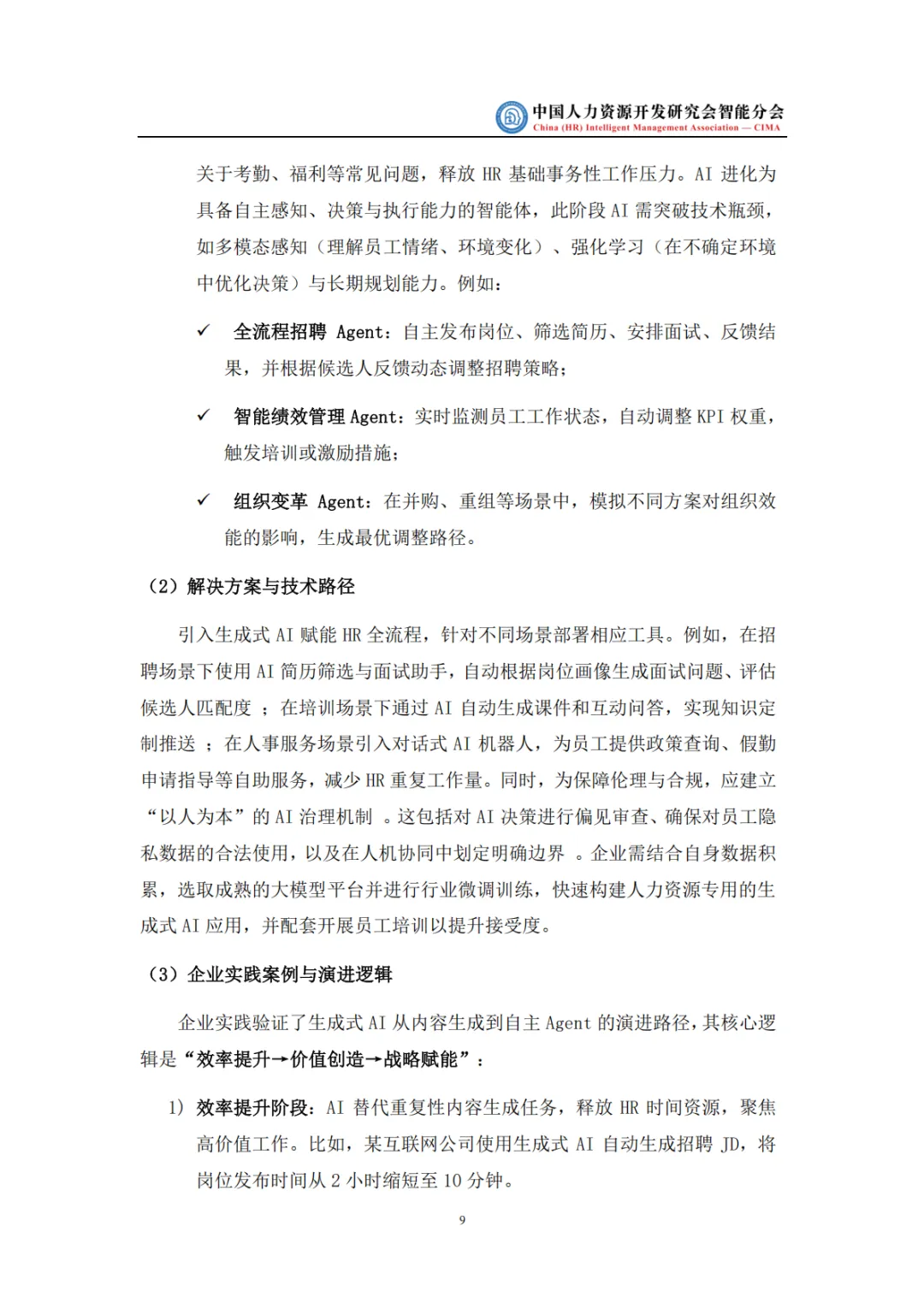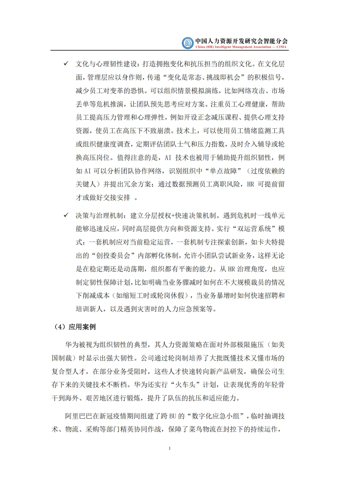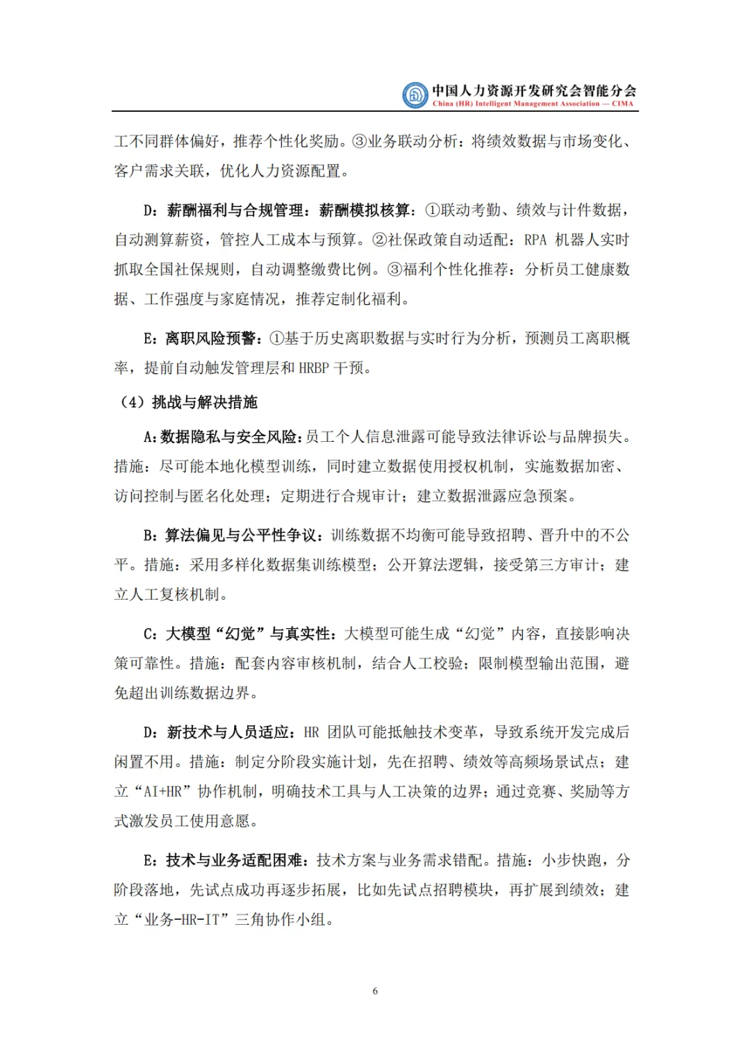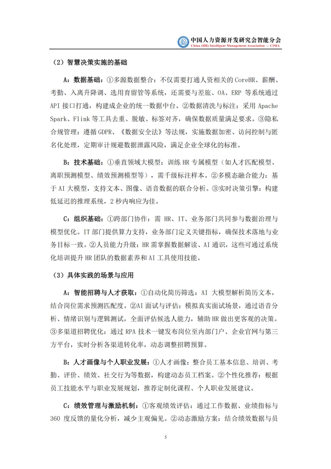 然而,技术进步的脚步从未停歇。ChatGPT、Claude、DeepSeek 等大语言模型的广泛应用,多模态 AI 在视觉、语音、文本理解方面的突破,以及具身智能、元宇宙等新兴技术的快速发展,正在催生全新的人力资源管理范式。企业对于更加智能化、个性化、生态化的 HR 服务需求日益迫切,传统的数字化工具已无法满足组织在复杂多变环境中的人才管理挑战。基于此背景,中国人力资源开发研究会智能分会组织专家团队,历时半年深度调研,形成了《中国人力资源数智化发展白皮书》2025 年版。本版白皮书在继承 2023 年版研究成果基础上,结合最新前沿技术,重点提出了面向 2026-2030 年的五大核心发展趋势:自主进化的 HR 智能体生态、生成式 AI 驱动的组织进化引擎、具身智能数字化员工普及化、混合智能决策系统、元宇宙人力资源实验室。
