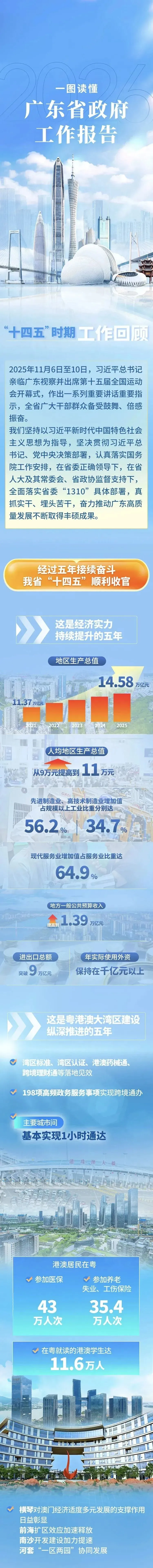1月26日,广东省十四届人大五次会议在广州开幕,广东省省长孟凡利向大会作政府工作报告。报告指出,2025年广东地区生产总值增长3.9%,总量连续37年居全国首位。地方一般公共预算收入增长3%。货物进出口总额9.5万亿元,增长4.4%,贡献了全国24.1%增量。