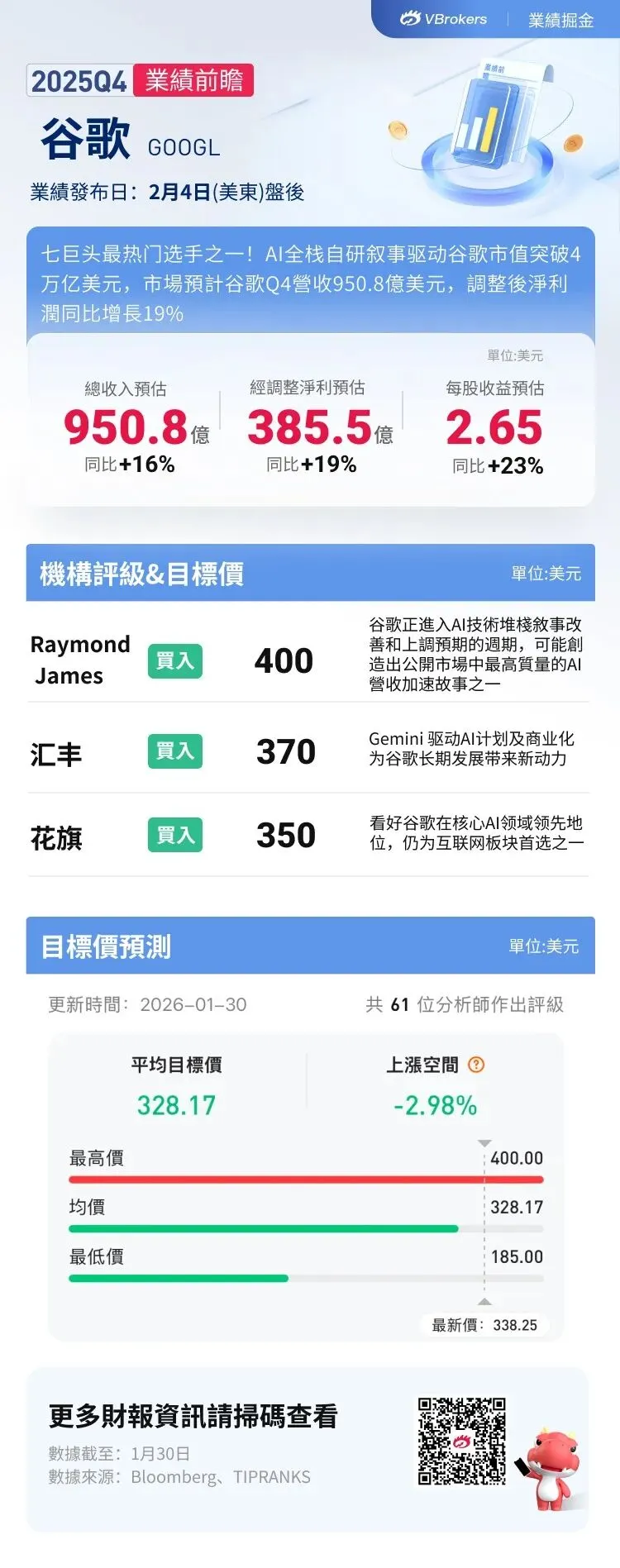 谷歌股价在2025年累计涨幅超过65%,成为“七巨头”中表现最亮眼的公司之一,这得益于市场对其“AI全栈自研”能力的叙事从怀疑转向全面认可。进入2026年,随着与苹果达成重磅AI合作,其市值在1月首次突破4万亿美元大关。接下来,市场焦点转向谷歌将于美东时间2月4日盘后发布的2025年Q4财报,这份成绩单能否大超预期、继续推高股价?截至1月29日,期权市场上,谷歌获近七成看涨期权押注,其中一期权大单押注谷歌绩后股价上涨至360美元。 据彭博分析师预期,谷歌2025年Q4营收为950.8亿美元,同比增长16%;经调整净利385.5亿美元,同比增长19%;GAAP每股收益2.65,同比增长23%。据TipRank统计,谷歌已连续11个财季每股收益超预期;在过去8个财季,谷歌业绩公布后的股价平均变动为-0.2%,最大涨幅为+ 10.22% ,最大跌幅为 -7.5% ,财报后股价上涨概率为62.5%。上季度,谷歌营收、净利均超预期,总营收为1023.46亿美元,同比增长16%,净利润为349.79亿美元,同比增长33%。营收和利润都超过市场预期,且季度营收首次突破1000亿美元。具体来看,谷歌的搜索和广告仍显示出两位数增长,Q3谷歌的广告收入742亿美元,整体增长9.9%。搜索部门收入为565.6亿美元,同比增长15%,仅联盟广告继续小幅下滑。云业务板块是谷歌的第二增长曲线,景气度持续。Q3收入为151.5亿美元,同比增长35%,高于预期的147.4亿美元。云业务表现主要看积存的未履约订单(Revenue Backlog),截至Q3末,积存订单达到1550亿,同比增长43%,环比净增470亿。市场预计,有了这些订单存货,云业务的收入增速可以在一段时间继续保持在30%以上。并且在资本支出上,谷歌上季度表示,2025年资本支出将达910亿美元至930亿美元,远超市场预期。Q4业绩看点:云业务为增长引擎,AI全栈自研成焦点对于Q4财报,市场主要关注点在AI驱动广告业务增长情况、云业务增速、AI全栈自研商业化进展(包含Gemini生态构建、TPU商业化进程)及资本开支增速及相关细节。广告业务是谷歌的基本盘,营收占比超75%-80%。搜索广告方面,谷歌AI搜索已在 200 多个国家和地区推出,支持 40 多种不同语言,月活用户达20亿人次,并且谷歌通过A/B Test得出结论:AI 搜索可使搜索量增长10%,进一步提升用户粘性;此外,Performance-Max全面渗透谷歌广告,降低广告主成本,提升广告效果,带动谷歌广告价格和收入全面提升。 华尔街预期搜索广告收入Q4将同比增长13.7% 。花旗分析师认为,随着 UCP 和Direct Offers等新功能上线(依托Google超过500亿条商品列表及Agentic Travel等核心垂直领域),代理商务领域也展现出新增长动能。YouTube广告方面,Youtube平台拥有全球用户数超27亿人,稳居全球第二大社交媒体。随着Youtube TV和会员订阅业务的不断增长, 华尔街预期Q4YouTube广告营收将同比增长13.5% 。此外,此前有报道称,英国BBC和法国CMA都即将与YouTube签署合作协议,同时在圣诞节前夕,YouTube宣布奥斯卡颁奖典礼将从2029年起在YouTube上直播,YouTube的平台影响力将进一步提升。云业务是增长最快的板块,被视为谷歌第二大增长曲线, 华尔街普遍预期Q4云业务将同比增长35% ,花旗分析师认为增长的动力主要来源于Gemini 应用、TPU以及Q3云业务积存订单。自今年3月Gemini 2.5版本首次发布以来,Gemini接口调用量从约350亿次一路攀升,到8月已增至约850亿次,实现超过140%的增长,Gemini企业订阅用户已增长至800万,Gemini的热销进一步提振谷歌云业务的营收。此外,谷歌与Anthropic达成百万片TPU,总值约500+亿美元的芯片出售和算力租赁合同,IaaS业务有望乘风而起。AI全栈自研商业化进展依旧是市场关注焦点。从TPU v6升级至TPU v7,单位token推理成本下降约70%,为谷歌IaaS业务形成竞争优势。此外,苹果近期与谷歌达成合作,未来的基础 AI 模型将基于谷歌的 Gemini 及其云技术打造,并将用于支持包括全新个性化 Siri 在内的多项 Apple Intelligence 功能,个人智能助手业务能否成为谷歌新的增长引擎也是市场关注焦点。资本支出方面,谷歌预期2025年资本开支910~930亿美元,四季度在280亿美元左右。此外,谷歌还宣布今年的开支增速也会维持高位,市场预期在1140亿美元,并且将更关注资本开支的细节。据TipRanks最新数据显示,基于 33 位华尔街分析师在过去三个月内对谷歌提出的 12 个月目标价格,平均目标价为 347.70 美元 ,最高预测为390美元 ,最低预测为 279.美元 。Raymond James:进入AI技术堆栈叙事改善和上调预期周期Raymond James认为可能谷歌正进入AI技术堆栈叙事改善和上调预期的周期,这可能创造出公开市场中最高质量的AI营收加速故事之一。分析师认为,AI驱动的收入加速将显著提升2026-2027年业绩预期,尤其是Google云端平台(GCP)与搜寻业务。GCP增长预计将超越市场预期,受惠于TPU/GPU部署及AI服务普及;搜寻业务亦有望因AI功能提升查询量与变现能力。基于AI带动的增长动能, 给出400美元目标价 ,对应2027年预期盈利的29倍市盈率。花旗:看好谷歌在核心AI领域领先地位,仍为互联网板块首选之一花旗表示,苹果与谷歌达成多年人工智能合作协议,苹果智能平台Apple Intelligence(包括Siri)及其基础模型将采用Google的AI技术,特别是其旗舰产品Gemini模型的强大能力、日益增长的计算基础设施及硬件技术优势,突显了谷歌在核心AI领域的领先地位。此外,谷歌的AI生态系统持续扩展,核心产品Gemini的应用月活跃用户(MAUs)在去年12月录得按月10%的增长。自11月推出Gemini 3及相关产品以来,市场份额稳步提升,带