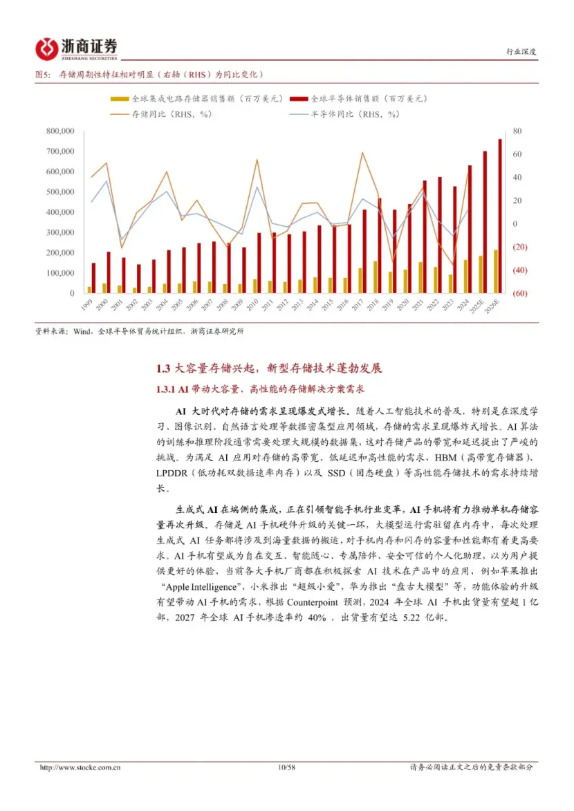 AI训练与推理对显存带宽及容量的迫切需求,正驱动存储行业进入新一轮成长周期,存储产品呈现量价齐升态势。随着AI应用愈加广泛,特别是在深度学习、图像识别、自然语言处理等数据密集型领域渗透,存做绪的需求呈现明显增长。