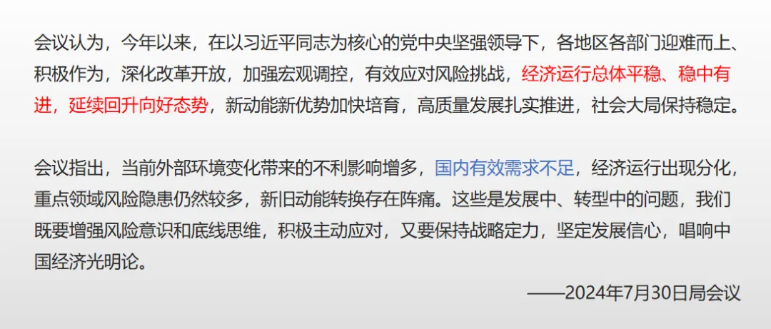 在之前7月的最高层会议上,对经济的评价还是总体平稳、稳中有进、延续回升良好态势